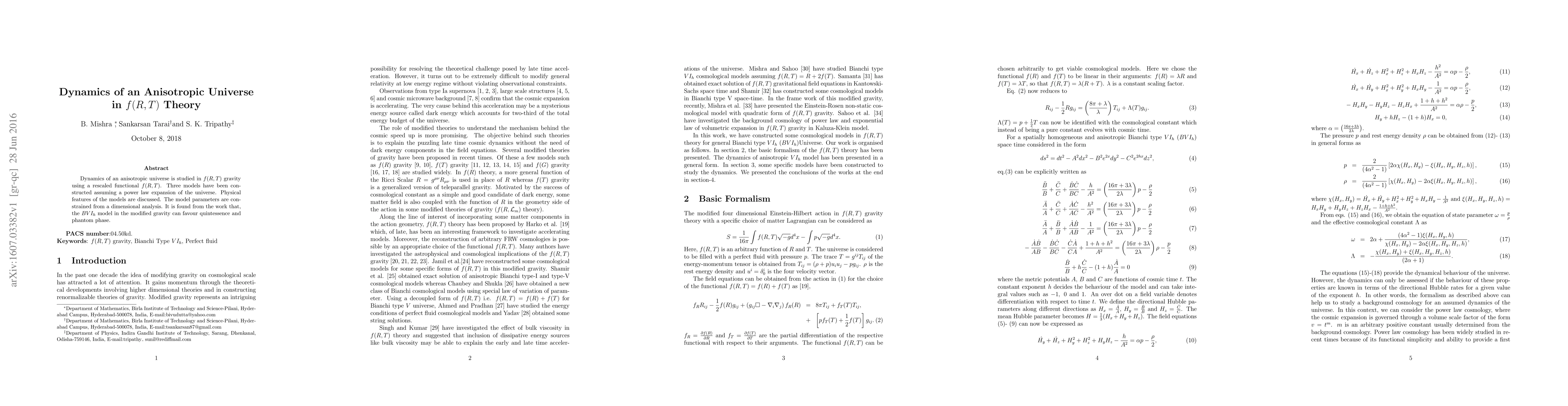 Dynamics of an anisotropic universe is studied in $f(R,T)$ gravity using a rescaled functional $f(R,T)$. Three models have been constructed assuming a power law expansion of the universe. Physical features of the models are discussed. The model parameters are constrained from a dimensional analysis. It is found from the work that, the $BVI_h$ model in the modified gravity can favour quintessence and phantom phase.
