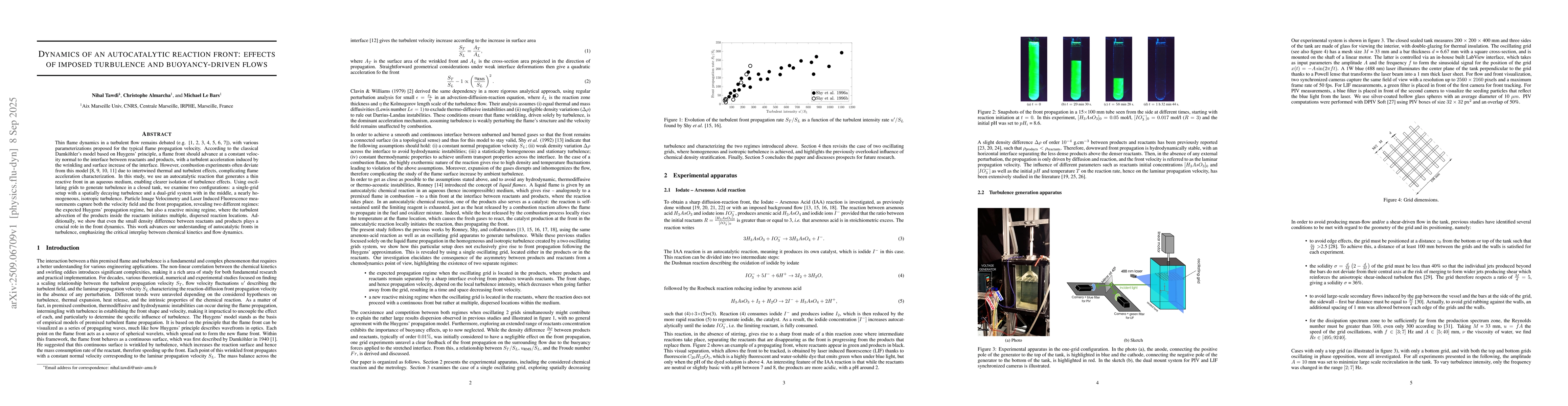 Thin flame dynamics in a turbulent flow remains debated, with various parameterizations proposed for the typical flame propagation velocity. According to the classical Damk\"ohler's model based on Huygens' principle, a flame front should advance at a constant velocity normal to the interface between reactants and products, with a turbulent acceleration induced by the wrinkling and surface increase of the interface. However, combustion experiments often deviate from this model due to intertwined thermal and turbulent effects, complicating flame acceleration characterization. In this study, we use an autocatalytic reaction that generates a thin reactive front in an aqueous medium, enabling clearer isolation of turbulence effects. Using oscillating grids to generate turbulence in a closed tank, we examine two configurations: a single-grid setup with a spatially decaying turbulence and a dual-grid system with in the middle, a nearly homogeneous, isotropic turbulence. Particle Image Velocimetry and Laser Induced Fluorescence measurements capture both the velocity field and the front propagation, revealing two different regimes: the expected Huygens' propagation regime, but also a reactive mixing regime, where the turbulent advection of the products inside the reactants initiates multiple, dispersed reaction locations. Additionally, we show that even the small density difference between reactants and products plays a crucial role in the front dynamics. This work advances our understanding of autocatalytic fronts in turbulence, emphasizing the critical interplay between chemical kinetics and flow dynamics.