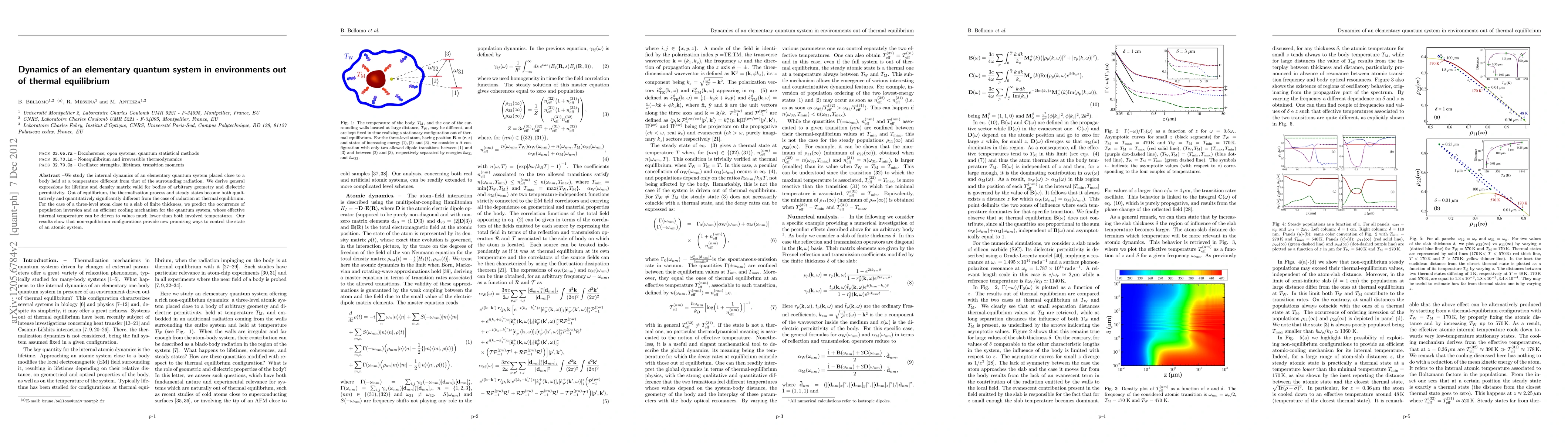 This paper investigates the dynamics of an elementary quantum system in non-equilibrium environments, deriving expressions for lifetime and density matrix. It predicts population inversion and efficient cooling mechanisms in a three-level atom near a non-equilibrium body, demonstrating new methods for controlling atomic states.