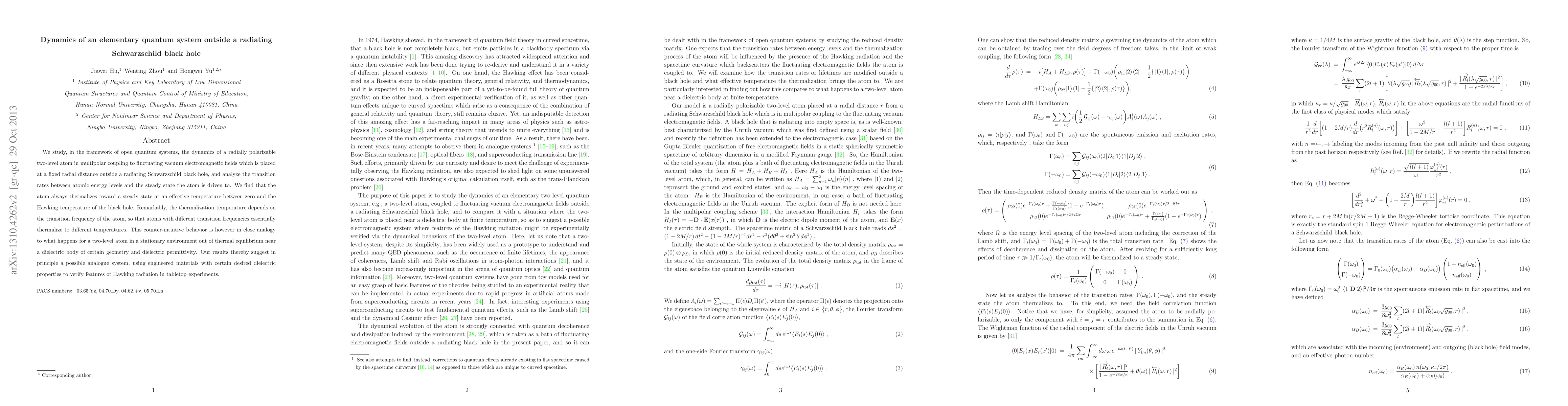 We study, in the framework of open quantum systems, the dynamics of a radially polarizable two-level atom in multi-polar coupling to fluctuating vacuum electromagnetic fields which is placed at a fixed radial distance outside a radiating Schwarzschild black hole, and analyze the transition rates between atomic energy levels and the steady state the atom is driven to. We find that the atom always thermalizes toward a steady state at an effective temperature between zero and the Hawking temperature of the black hole. Remarkably, the thermalization temperature depends on the transition frequency of the atom, so that atoms with different transition frequencies essentially thermalize to different temperatures. This counter-intuitive behavior is however in close analogy to what happens for a two-level atom in a stationary environment out of thermal equilibrium near a dielectric body of certain geometry and dielectric permittivity. Our results thereby suggest in principle a possible analogue system using engineered materials with certain desired dielectric properties to verify features of Hawking radiation in lab-top experiments.