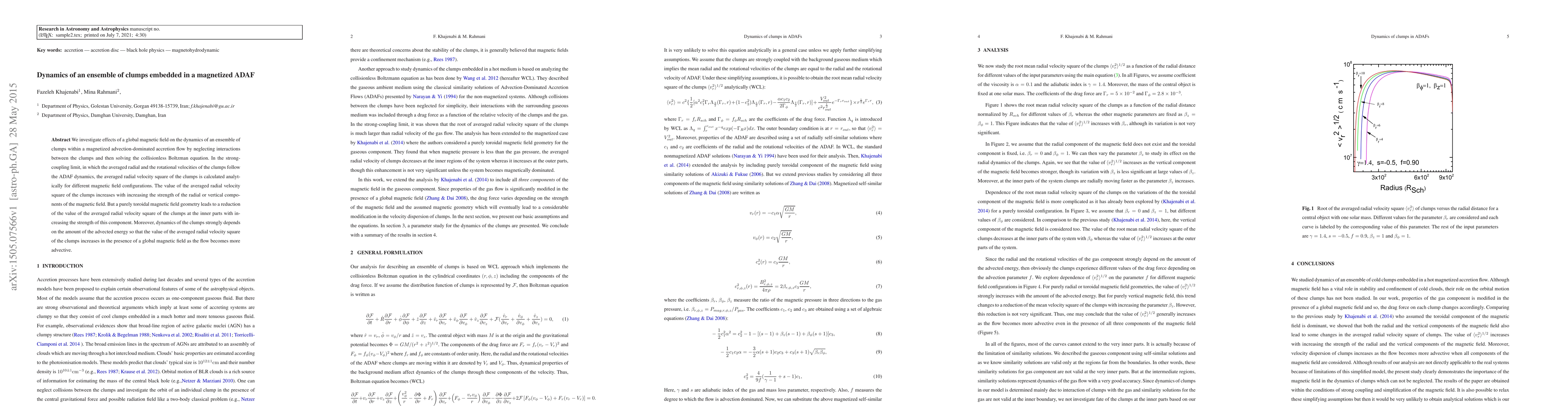 This paper examines the influence of a global magnetic field on clump dynamics within a magnetized advection-dominated accretion flow (ADAF), finding that the averaged radial velocity square of clumps increases with stronger radial or vertical magnetic fields, while a toroidal magnetic field reduces this velocity in the inner parts. The dynamics are also strongly dependent on the amount of advected energy, with higher advection leading to increased clump velocities.