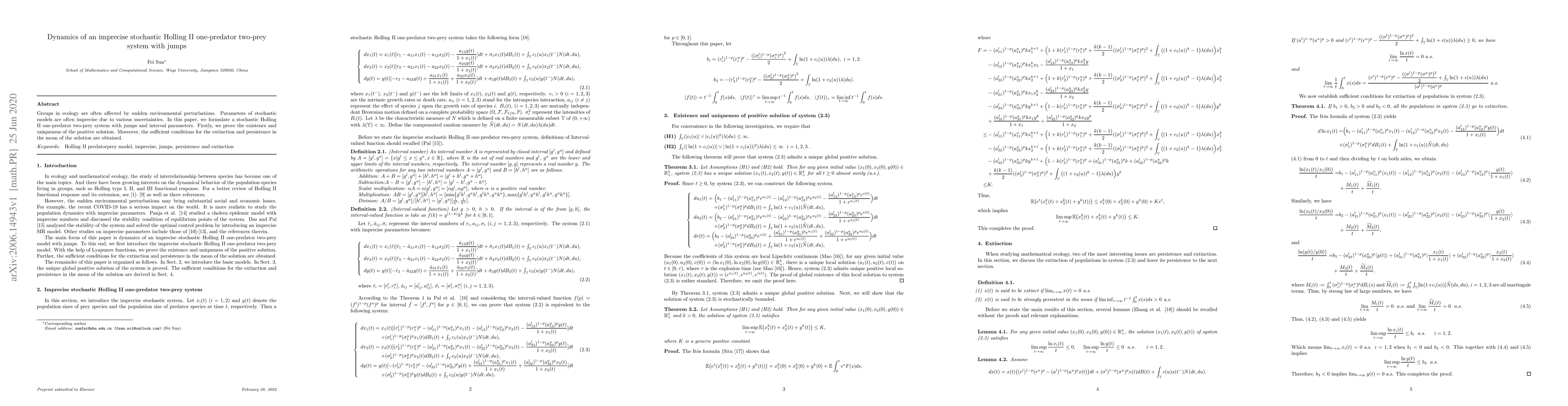 This paper formulates a stochastic Holling II model for a one-predator two-prey system with jumps and imprecise parameters. The study proves the existence and uniqueness of a positive solution and provides conditions for extinction and persistence in the mean.
