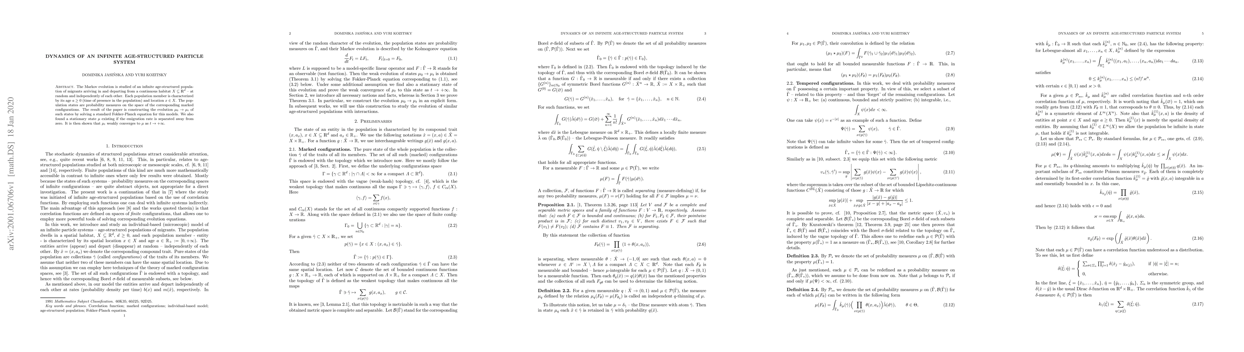 This paper studies the evolution of an infinite age-structured population of migrants in a habitat, finding that it converges to a stationary state as time increases, and solves a Fokker-Planck equation for its dynamics.