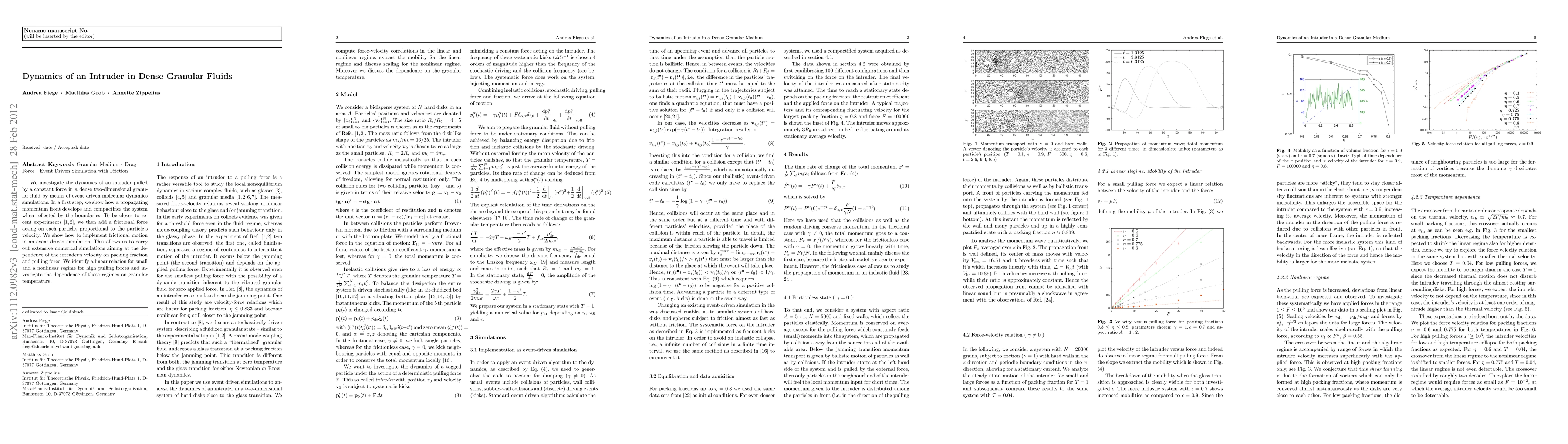 We investigate the dynamics of an intruder pulled by a constant force in a dense two-dimensional granular fluid by means of event-driven molecular dynamics simulations. In a first step, we show how a propagating momentum front develops and compactifies the system when reflected by the boundaries. To be closer to recent experiments \cite{candelier2010journey,candelier2009creep}, we then add a frictional force acting on each particle, proportional to the particle's velocity. We show how to implement frictional motion in an event-driven simulation. This allows us to carry out extensive numerical simulations aiming at the dependence of the intruder's velocity on packing fraction and pulling force. We identify a linear relation for small and a nonlinear regime for high pulling forces and investigate the dependence of these regimes on granular temperature.