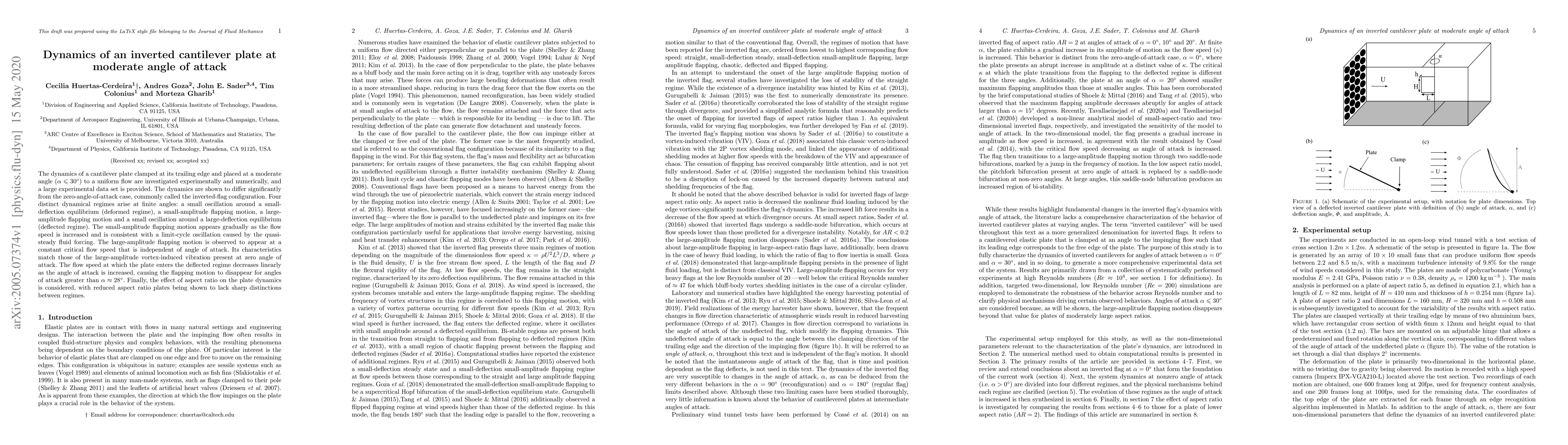 The dynamics of a cantilever plate clamped at its trailing edge and placed at a moderate angle ($\alpha \leq 30^{\circ}$) to a uniform flow are investigated experimentally and numerically, and a large experimental data set is provided. The dynamics are shown to differ significantly from the zero-angle-of-attack case, commonly called the inverted-flag configuration. Four distinct dynamical regimes arise at finite angles: a small oscillation around a small-deflection equilibrium (deformed regime), a small-amplitude flapping motion, a large-amplitude flapping motion and a small oscillation around a large-deflection equilibrium (deflected regime). The small-amplitude flapping motion appears gradually as the flow speed is increased and is consistent with a limit-cycle oscillation caused by the quasi-steady fluid forcing. The large-amplitude flapping motion is observed to appear at a constant critical flow speed that is independent of angle of attack. Its characteristics match those of the large-amplitude vortex-induced vibration present at zero angle of attack. The flow speed at which the plate enters the deflected regime decreases linearly as the angle of attack is increased, causing the flapping motion to disappear for angles of attack greater than $\alpha \approx 28^{\circ}$. Finally, the effect of aspect ratio on the plate dynamics is considered, with reduced aspect ratio plates being shown to lack sharp distinctions between regimes.