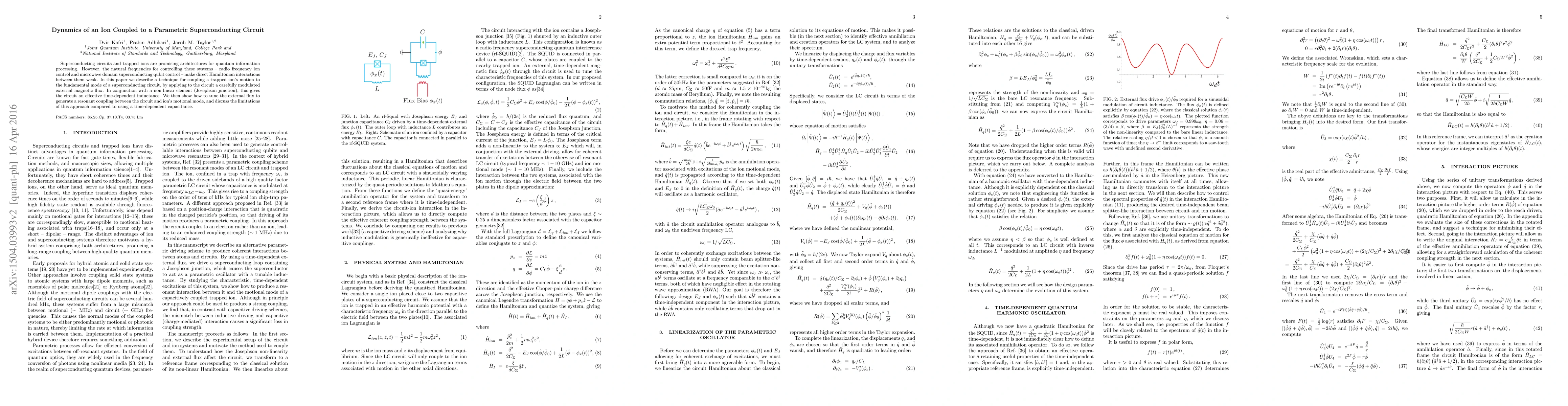 Superconducting circuits and trapped ions are promising architectures for quantum information processing. However, the natural frequencies for controlling these systems -- radio frequency ion control and microwave domain superconducting qubit control -- make direct Hamiltonian interactions between them weak. In this paper we describe a technique for coupling a trapped ion's motion to the fundamental mode of a superconducting circuit, by applying to the circuit a carefully modulated external magnetic flux. In conjunction with a non-linear element (Josephson junction), this gives the circuit an effective time-dependent inductance. We then show how to tune the external flux to generate a resonant coupling between the circuit and ion's motional mode, and discuss the limitations of this approach compared to using a time-dependent capacitance.