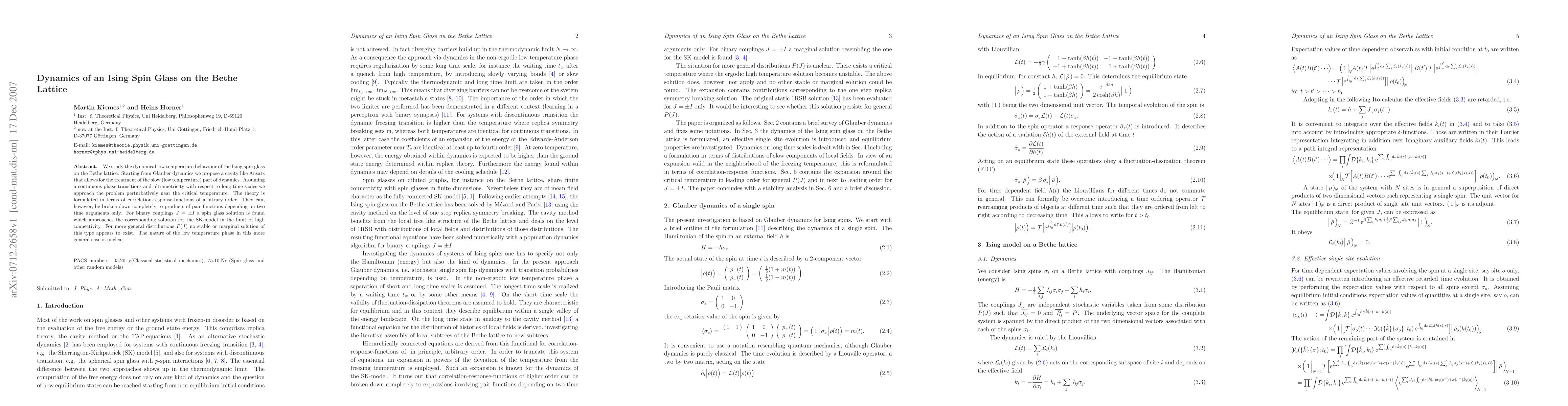 This paper investigates the low-temperature dynamics of Ising spin glasses on the Bethe lattice using Glauber dynamics and a cavity Ansatz. It finds a stable solution for binary couplings resembling the SK-model, but no stable solution exists for more general coupling distributions, leaving the low-temperature phase nature unclear.