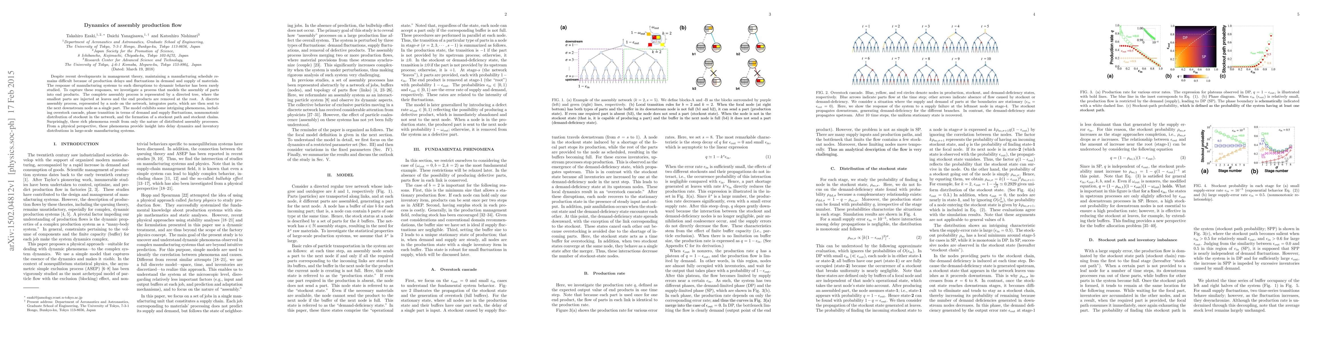 A study investigates dynamic behavior in assembly production flows, revealing phenomena such as overstock cascades and stockout chains, which provide insight into delay dynamics and inventory distributions in large-scale manufacturing systems.