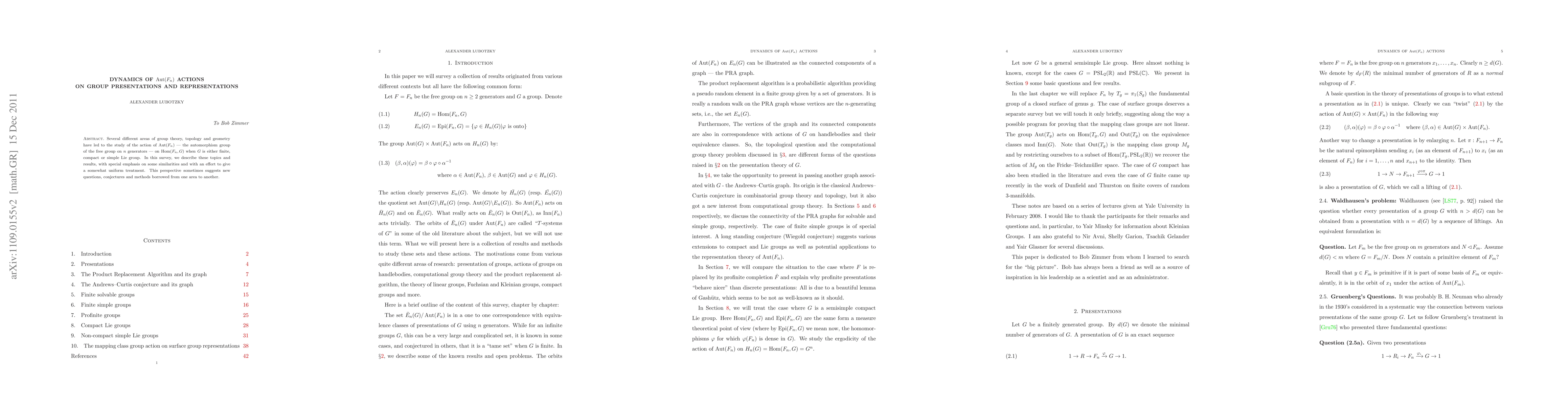 This survey paper explores the dynamics of Aut(Fn) actions on group presentations and representations, highlighting similarities between topology, geometry, and finite Lie groups, with new questions and methods emerging from the study.