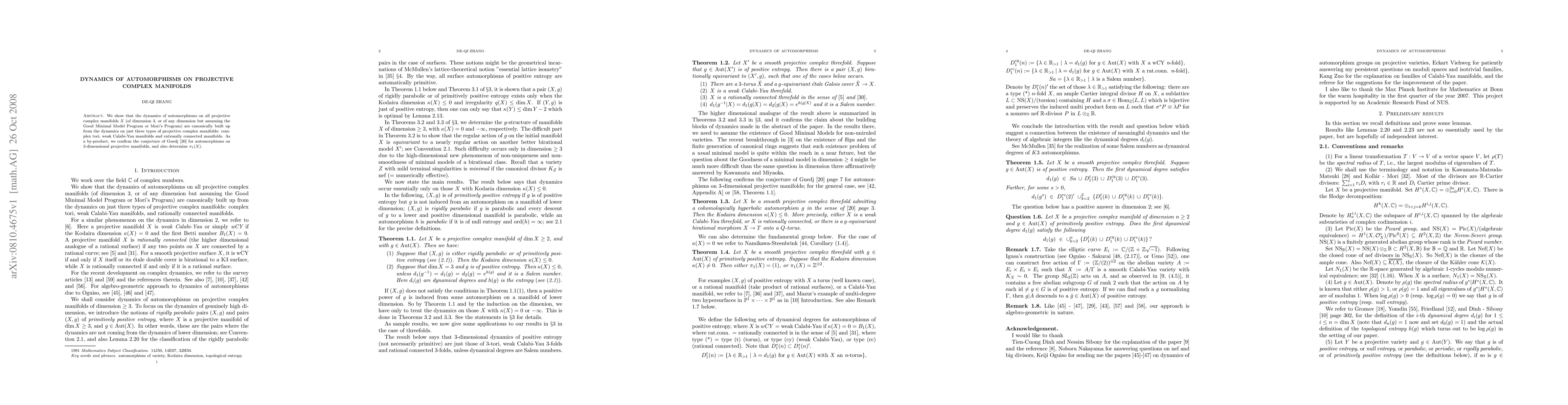 This paper demonstrates that the dynamics of automorphisms on projective complex manifolds are fundamentally derived from three types: complex tori, weak Calabi-Yau manifolds, and rationally connected manifolds. Additionally, it confirms Guedj's conjecture for 3D projective manifolds and determines the fundamental group pi_1(X).
