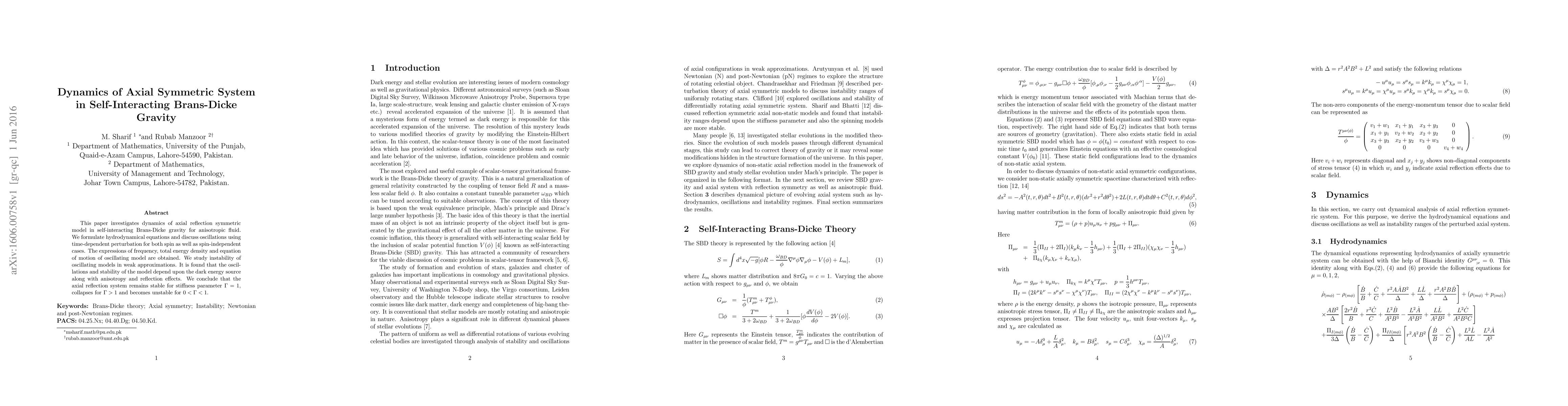 This paper explores the dynamics of axially symmetric systems in self-interacting Brans-Dicke gravity with anisotropic fluids, deriving hydrodynamic and oscillation equations. It finds that the model's stability depends on the dark energy source, anisotropy, and reflection effects, with stability for $\Gamma=1$, collapse for $\Gamma>1$, and instability for $0<\Gamma<1$.