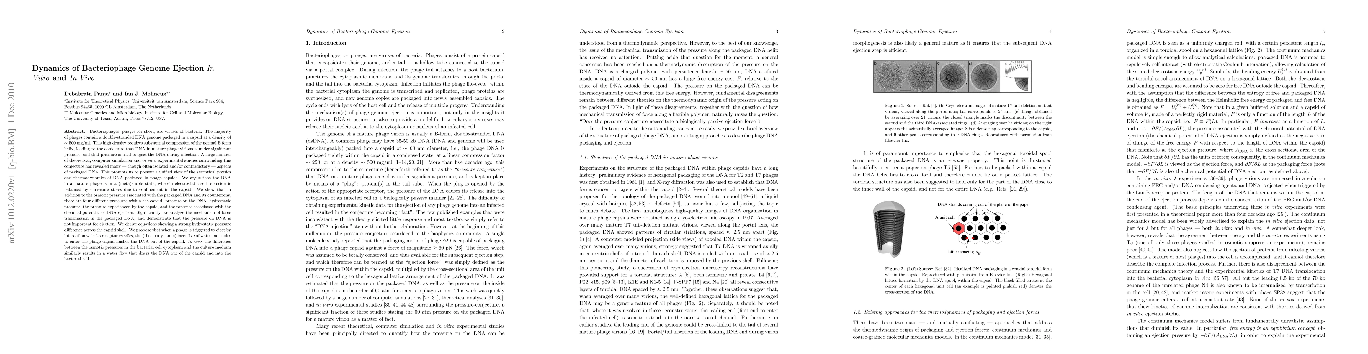 Bacteriophages, phages for short, are viruses of bacteria. The majority of phages contain a double-stranded DNA genome packaged in a capsid at a density of ~500 mg/ml. This high density requires substantial compression of the normal B form helix, leading to the conjecture that DNA in mature phage virions is under significant pressure, and that pressure is used to eject the DNA during infection. A large number of theoretical, computer simulation and in vitro experimental studies surrounding this conjecture has revealed many --- though often isolated and/or contradictory --- aspects of packaged DNA. This prompts us to present a unified view of the statistical physics and thermodynamics of DNA packaged in phage capsids. We argue that the DNA in a mature phage is in a (meta)stable state, wherein electrostatic self-repulsion is balanced by curvature stress due to confinement in the capsid. We show that in addition to the osmotic pressure associated with the packaged DNA and its counterions, there are four different pressures within the capsid: pressure on the DNA, hydrostatic pressure, the pressure experienced by the capsid, and the pressure associated with the chemical potential of DNA ejection. Significantly, we analyze the mechanism of force transmission in the packaged DNA, and demonstrate that the pressure on DNA is not important for ejection. We derive equations showing a strong hydrostatic pressure difference across the capsid shell. We propose that when a phage is triggered to eject by interaction with its receptor in vitro, the (thermodynamic) incentive of water molecules to enter the phage capsid flushes the DNA out of the capsid. In vivo, the difference between the osmotic pressures in the bacterial cell cytoplasm and the culture medium similarly results in a water flow that drags the DNA out of the capsid and into the bacterial cell.
