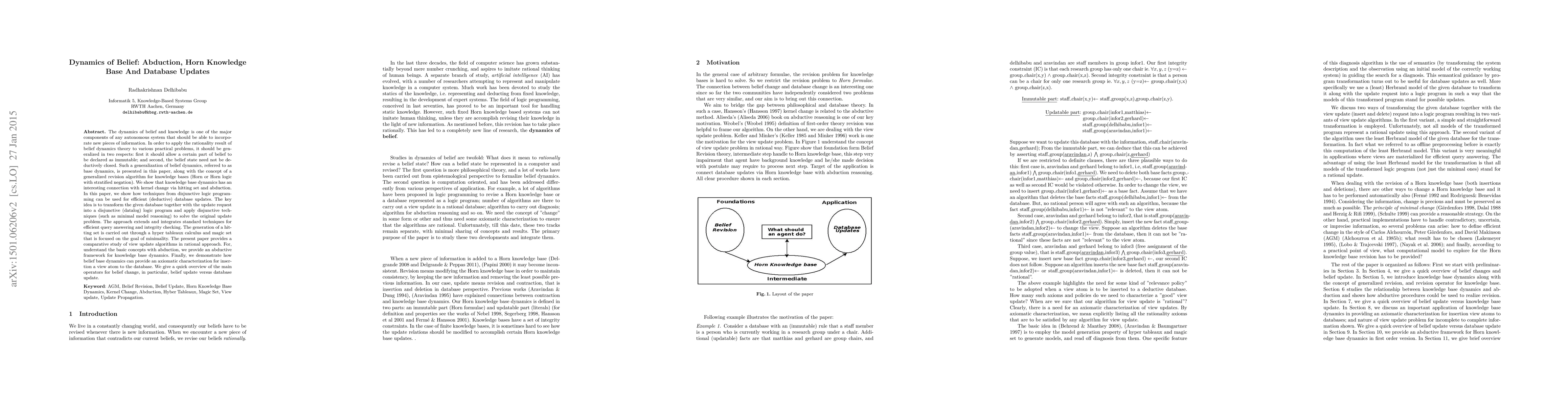 This paper explores the dynamics of belief and knowledge in autonomous systems, presenting a generalized belief dynamics theory termed "base dynamics." It introduces a revision algorithm for Horn knowledge bases and demonstrates the use of disjunctive logic programming techniques for efficient database updates, highlighting minimal model reasoning and a comparative study of view update algorithms.