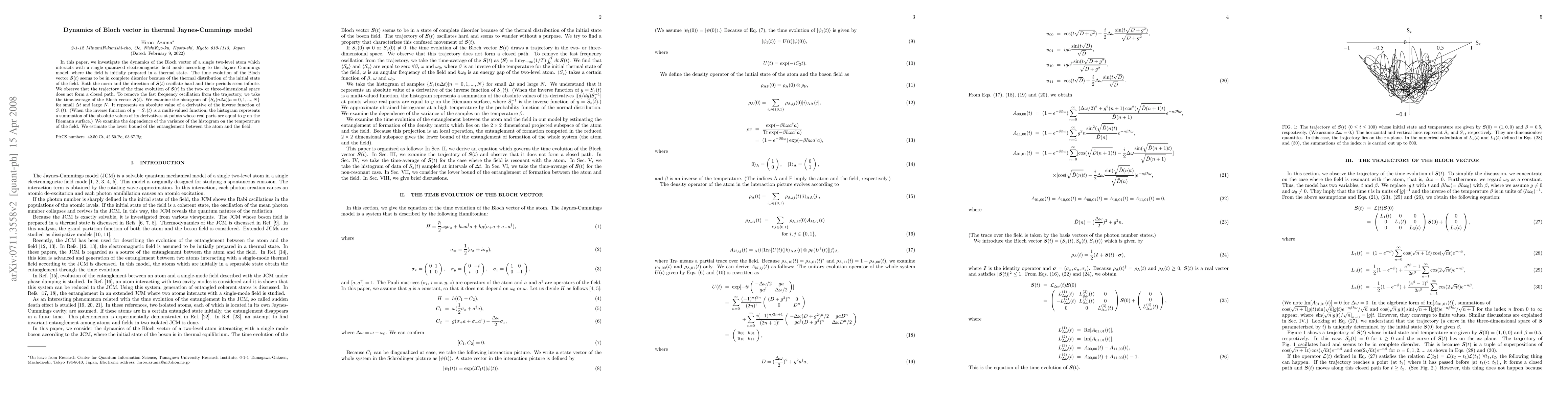 In this paper, we investigate the dynamics of the Bloch vector of a single two-level atom which interacts with a single quantized electromagnetic field mode according to the Jaynes-Cummings model, where the field is initially prepared in a thermal state. The time evolution of the Bloch vector S(t) seems to be in complete disorder because of the thermal distribution of the initial state of the field. Both the norm and the direction of S(t) oscillate hard and their periods seem infinite. We observe that the trajectory of the time evolution of S(t) in the two- or three-dimensional space does not form a closed path. To remove the fast frequency oscillation from the trajectory, we take the time-average of the Bloch vector S(t). We examine the histogram of {S_{z}(n\Delta t)|n=0,1,...,N} for small \Delta t and large N. It represents an absolute value of a derivative of the inverse function of S_{z}(t). (When the inverse function of y=S_{z}(t) is a multi-valued function, the histogram represents a summation of the absolute values of its derivatives at points whose real parts are equal to y on the Riemann surface.) We examine the dependence of the variance of the histogram on the temperature of the field. We estimate the lower bound of the entanglement between the atom and the field.