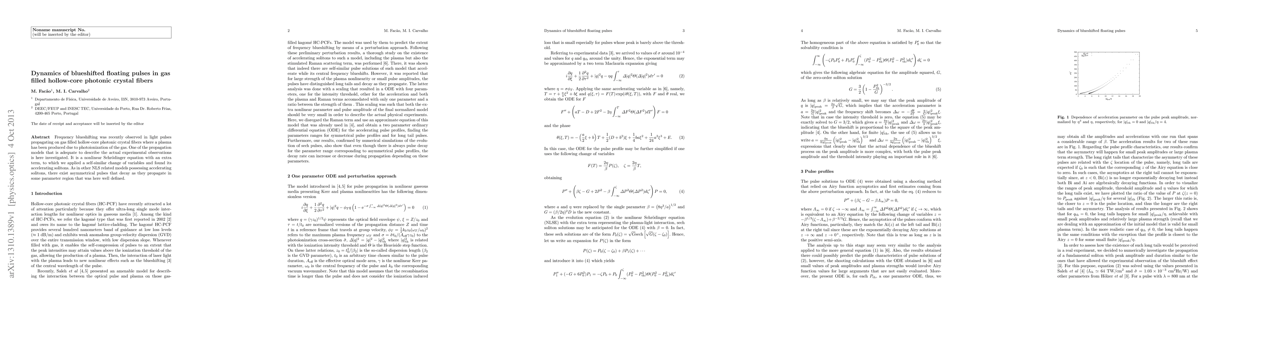 This paper investigates the dynamics of blueshifted pulses in gas-filled hollow-core photonic crystal fibers, focusing on a nonlinear Schrödinger equation model that describes experimental observations. The study reveals the existence of accelerating solitons and asymmetrical pulses that decay under certain conditions.