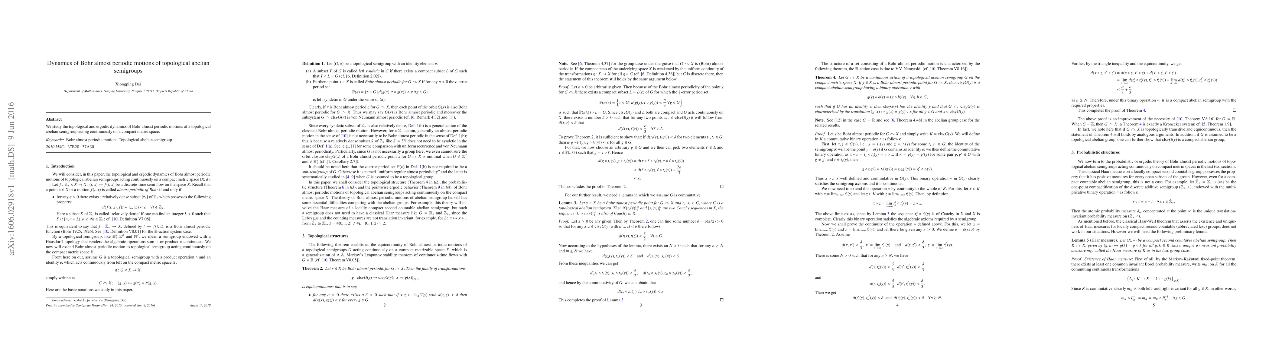 We study the topological and ergodic dynamics of Bohr almost periodic motions of a topological abelian semigroup acting continuously on a compact metric space.
