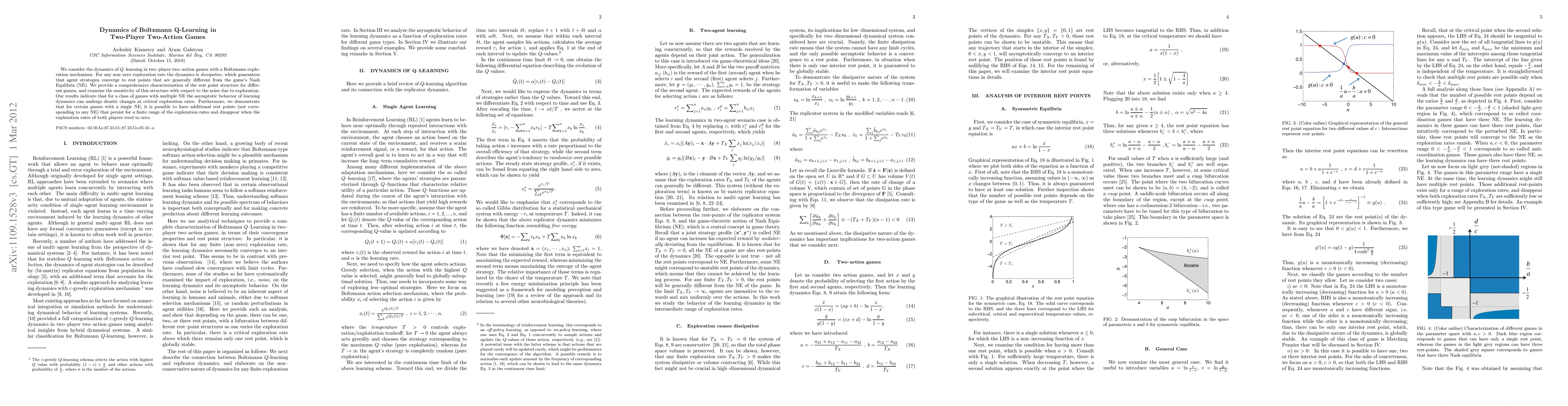This study explores the dynamics of Boltzmann Q-learning in two-player two-action games, demonstrating that non-zero exploration leads to dissipative dynamics, resulting in rest points that differ from Nash equilibria. It characterizes the rest point structure and reveals significant changes in learning dynamics at critical exploration rates, along with the emergence of non-equilibrium rest points in games with a single equilibrium.