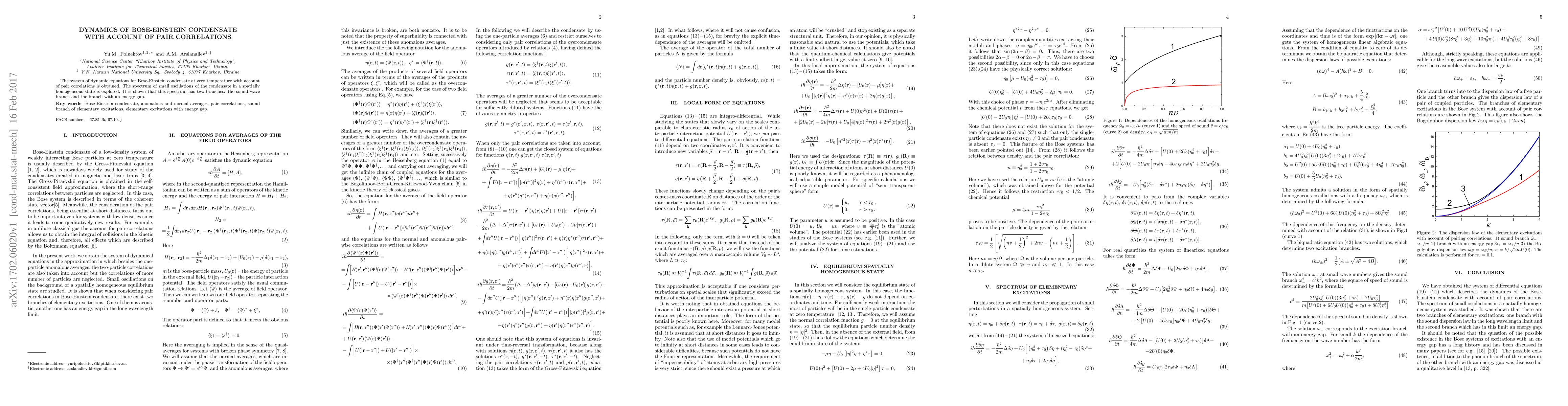 Summary: This paper derives dynamic equations for Bose-Einstein condensate at zero temperature, considering pair correlations, and explores its small oscillation spectrum, revealing two branches: a sound wave branch and a branch with an energy gap.