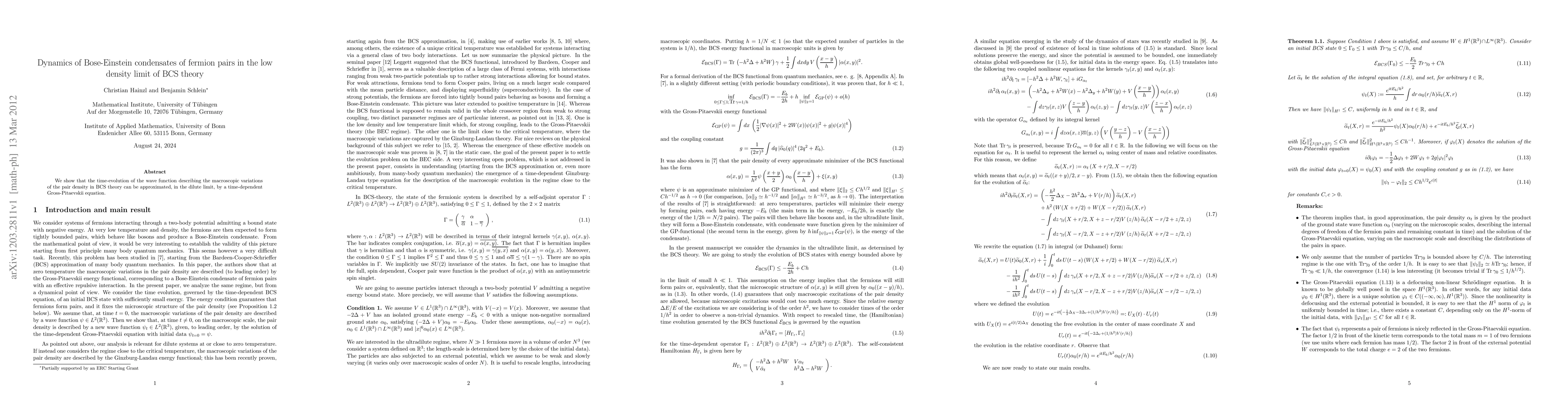 The paper demonstrates that in the low density regime of BCS theory, the time evolution of Bose-Einstein condensates formed by fermion pairs can be approximated using a time-dependent Gross-Pitaevskii equation.