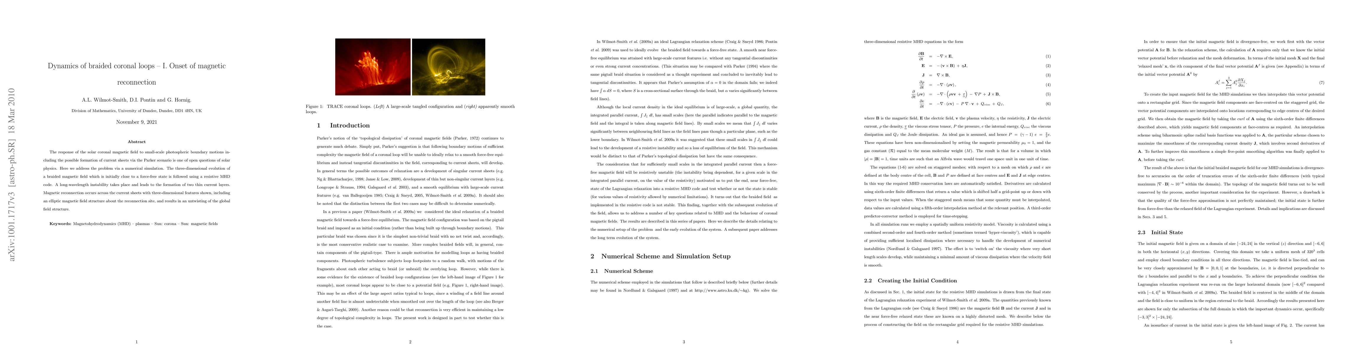 This paper investigates the onset of magnetic reconnection in braided coronal loops through a numerical simulation using a resistive MHD code. The study reveals the formation of thin current layers and three-dimensional reconnection features, leading to the untwisting of the global magnetic field structure.