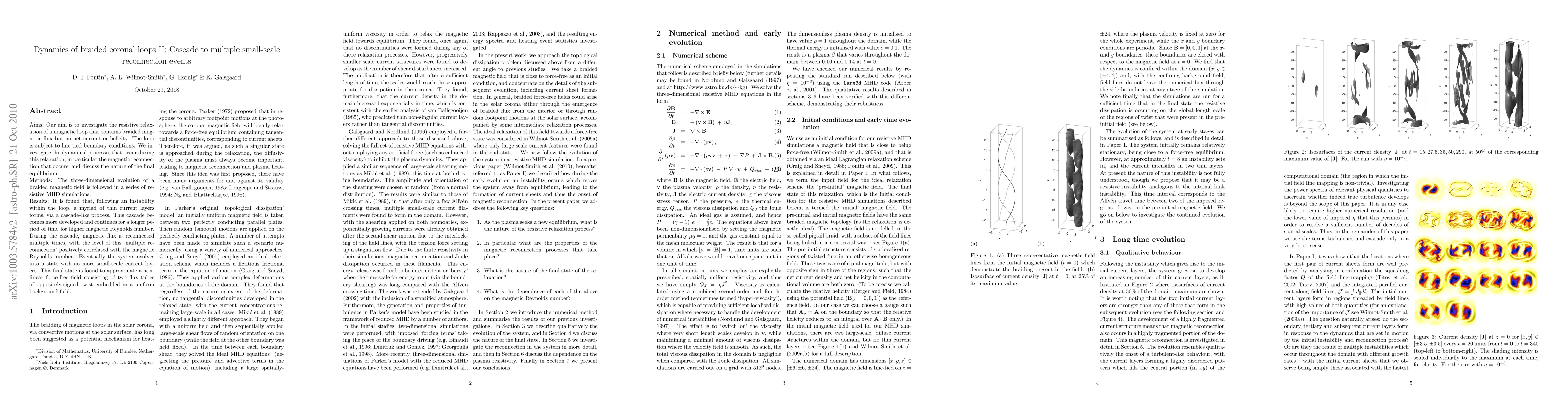 Aims: Our aim is to investigate the resistive relaxation of a magnetic loop that contains braided magnetic flux but no net current or helicity. The loop is subject to line-tied boundary conditions. We investigate the dynamical processes that occur during this relaxation, in particular the magnetic reconnection that occurs, and discuss the nature of the final equilibrium. Methods: The three-dimensional evolution of a braided magnetic field is followed in a series of resistive MHD simulations. Results: It is found that, following an instability within the loop, a myriad of thin current layers forms, via a cascade-like process. This cascade becomes more developed and continues for a longer period of time for higher magnetic Reynolds number. During the cascade, magnetic flux is reconnected multiple times, with the level of this `multiple reconnection' positively correlated with the magnetic Reynolds number. Eventually the system evolves into a state with no more small-scale current layers. This final state is found to approximate a non-linear force-free field consisting of two flux tubes of oppositely-signed twist embedded in a uniform background field.