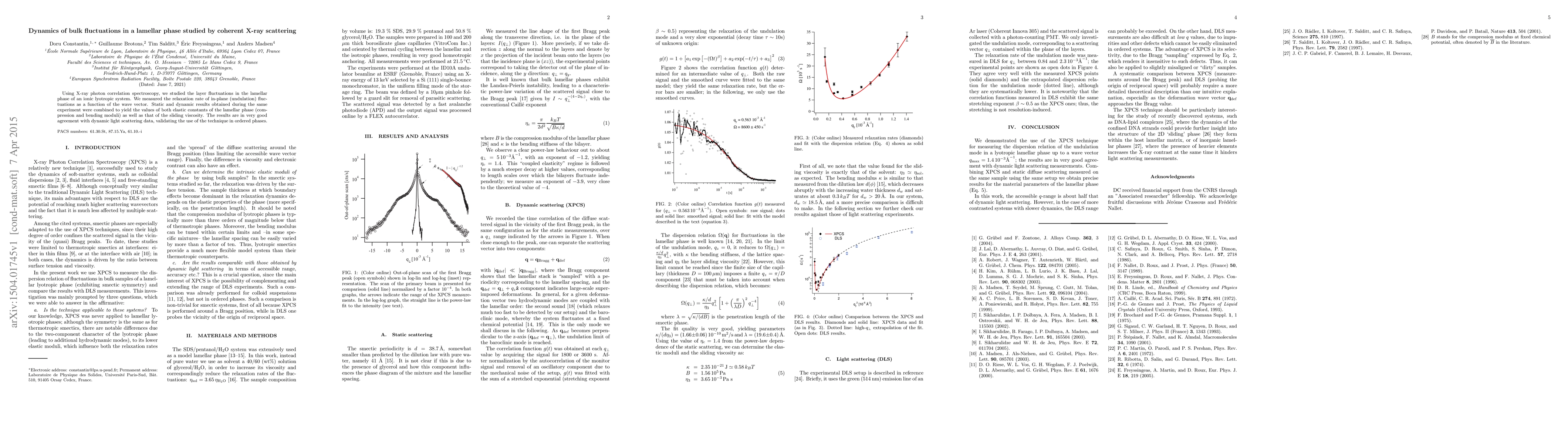 This paper investigates layer fluctuations in an ionic lyotropic lamellar phase using x-ray photon correlation spectroscopy, determining the relaxation rate of undulation fluctuations. The study successfully measures both elastic constants and sliding viscosity, validating the technique's applicability in ordered phases.