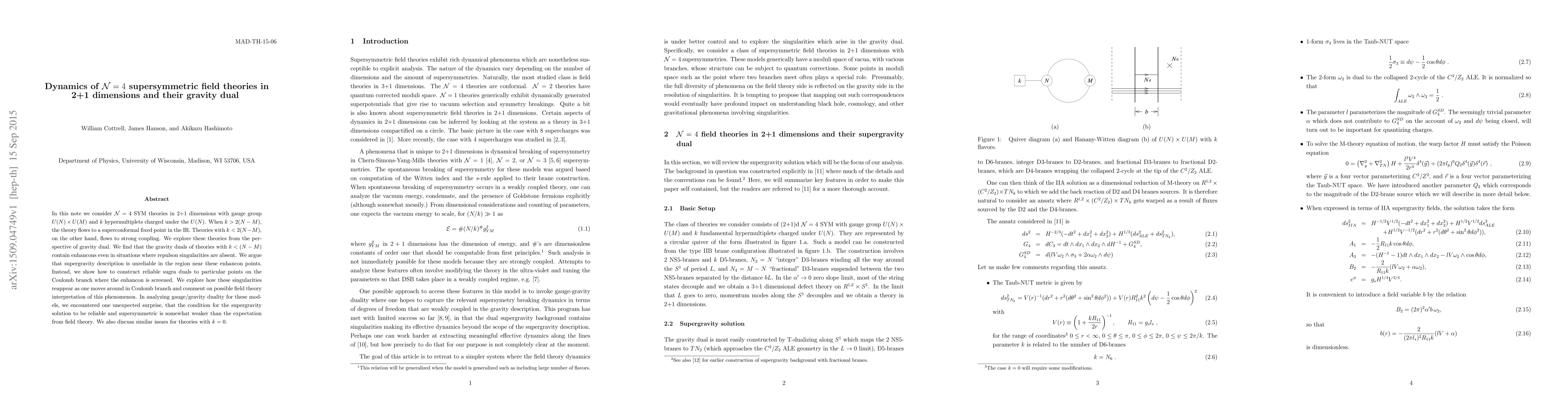 This paper examines ${\cal N}=4$ supersymmetric field theories in 2+1 dimensions and their gravity duals, revealing that when $k > 2(N-M)$, the theory reaches a superconformal fixed point, while $k < 2(N-M)$ leads to strong coupling. The study finds that supergravity is unreliable near certain enhancon points but proposes reliable duals in specific Coulomb branch regions, highlighting unexpected subtleties in gauge/gravity duality.