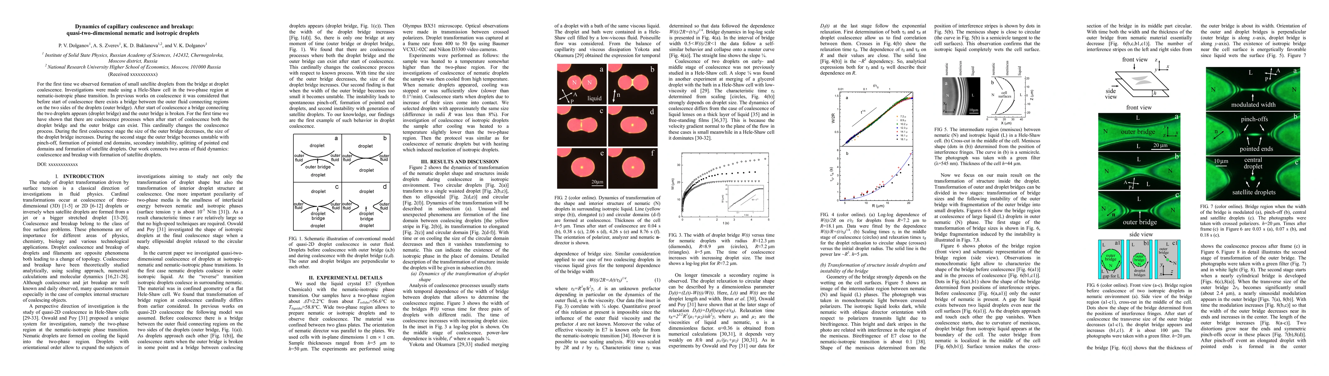 For the first time we observed formation of small satellite droplets from the bridge at droplet coalescence. Investigations were made using a Hele-Shaw cell in the two-phase region at nematic-isotropic phase transition. In previous works on coalescence it was considered that before start of coalescence there exists a bridge between the outer fluid connecting regions on the two sides of the droplets (outer bridge). After start of coalescence a bridge connecting the two droplets appears (droplet bridge) and the outer bridge is broken. For the first time we have shown that there are coalescence processes when after start of coalescence both the droplet bridge and the outer bridge can exist. This cardinally changes the coalescence process. During the first coalescence stage the size of the outer bridge decreases, the size of the droplet bridge increases. During the second stage the outer bridge becomes unstable with pinch-off, formation of pointed end domains, secondary instability, splitting of pointed end domains and formation of satellite droplets. Our work connects two areas of fluid dynamics: coalescence and breakup with formation of satellite droplets.