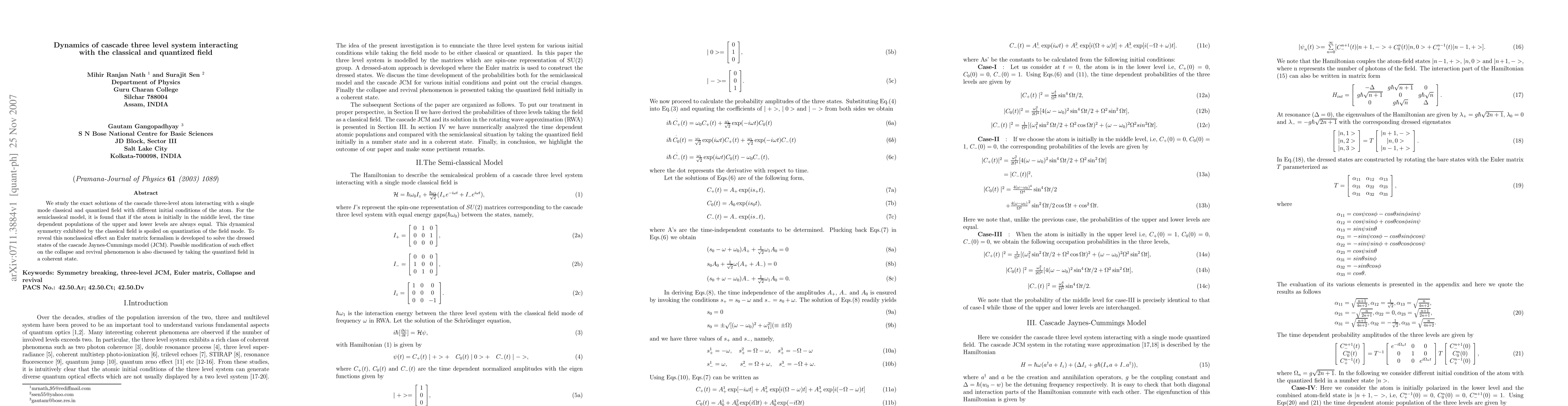 This paper investigates the dynamics of a cascade three-level atom interacting with both classical and quantized fields, finding that the semiclassical model exhibits a dynamical symmetry when the atom starts in the middle level. This symmetry is disrupted when the field is quantized, as demonstrated through an Euler matrix formalism, and the implications for collapse and revival phenomena are explored.