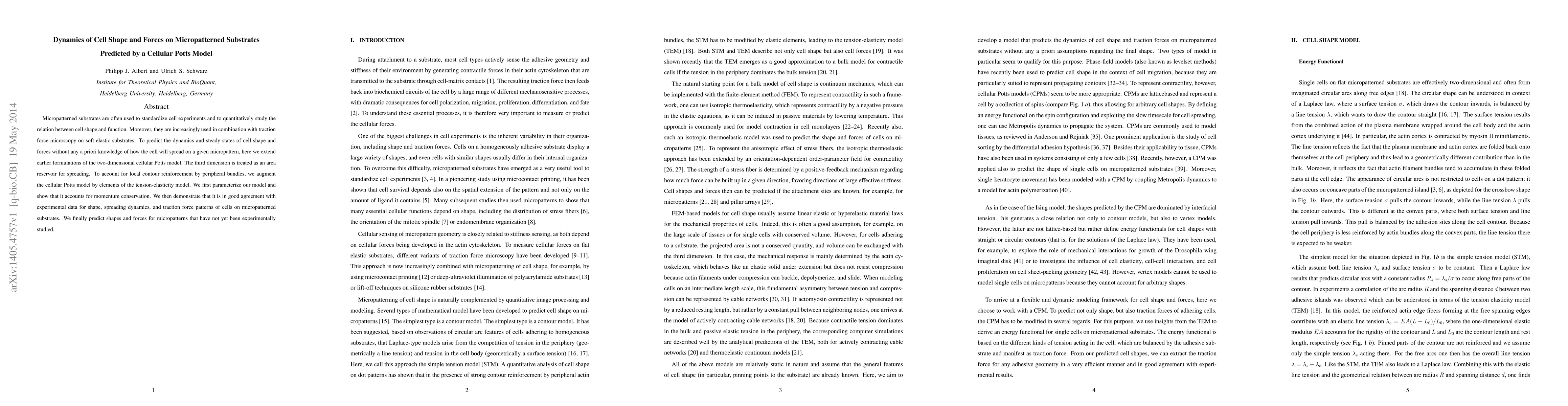 This paper extends the cellular Potts model to predict cell shape dynamics and forces on micropatterned substrates, incorporating elements of the tension-elasticity model for contour reinforcement. The model accurately matches experimental data and predicts outcomes for untested micropatterns.