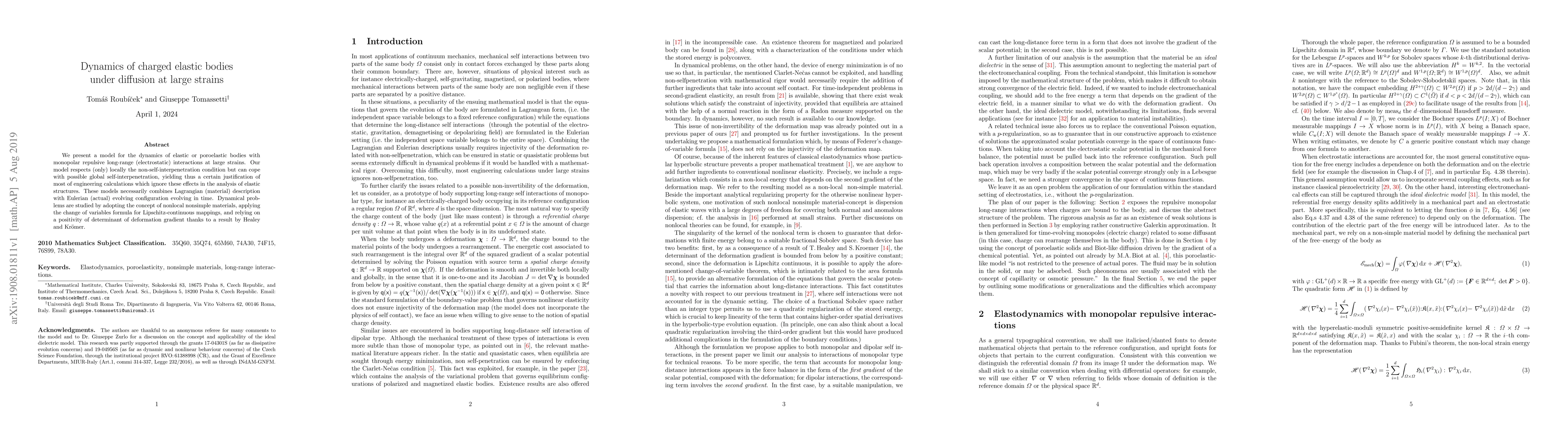 We present a model for the dynamics of elastic or poroelastic bodies with monopolar repulsive long-range (electrostatic) interactions at large strains. Our model respects (only) locally the non-self-interpenetration condition but can cope with possible global self-interpenetration, yielding thus a certain justification of most of engineering calculations which ignore these effects in the analysis of elastic structures. These models necessarily combine Lagrangian (material) description with Eulerian (actual) evolving configuration evolving in time. Dynamical problems are studied by adopting the concept of nonlocal nonsimple materials, applying the change of variables formula for Lipschitz-continuous mappings, and relying on the positivity of the determinant of the deformation gradient thanks to a result by Healey and Kroemer.