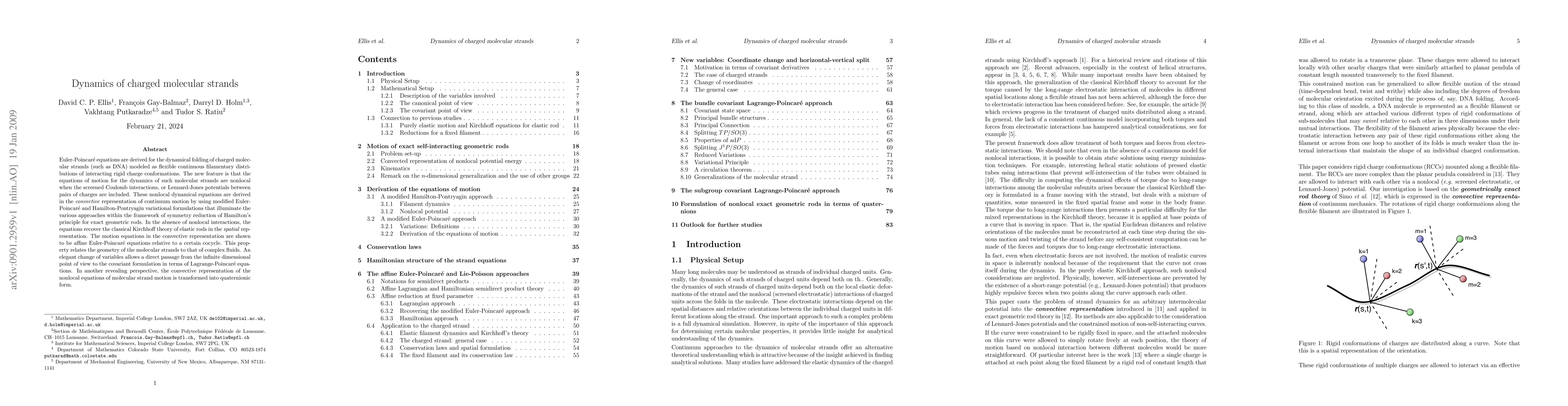 Euler-Poincare equations are derived for the dynamical folding of charged molecular strands (such as DNA) modeled as flexible continuous filamentary distributions of interacting rigid charge conformations. The new feature is that the equations of motion for the dynamics of such molecular strands are nonlocal when the screened Coulomb interactions, or Lennard-Jones potentials between pairs of charges are included. These nonlocal dynamical equations are derived in the convective representation of continuum motion by using modified Euler-Poincare and Hamilton-Pontryagin variational formulations that illuminate the various approaches within the framework of symmetry reduction of Hamilton's principle for exact geometric rods. In the absence of nonlocal interactions, the equations recover the classical Kirchhoff theory of elastic rods in the spatial representation. The motion equations in the convective representation are shown to be affine Euler-Poincare equations relative to a certain cocycle. This property relates the geometry of the molecular strands to that of complex fluids. An elegant change of variables allows a direct passage from the infinite dimensional point of view to the covariant formulation in terms of Lagrange-Poincare equations. In another revealing perspective, the convective representation of the nonlocal equations of molecular strand motion is transformed into quaternionic form.