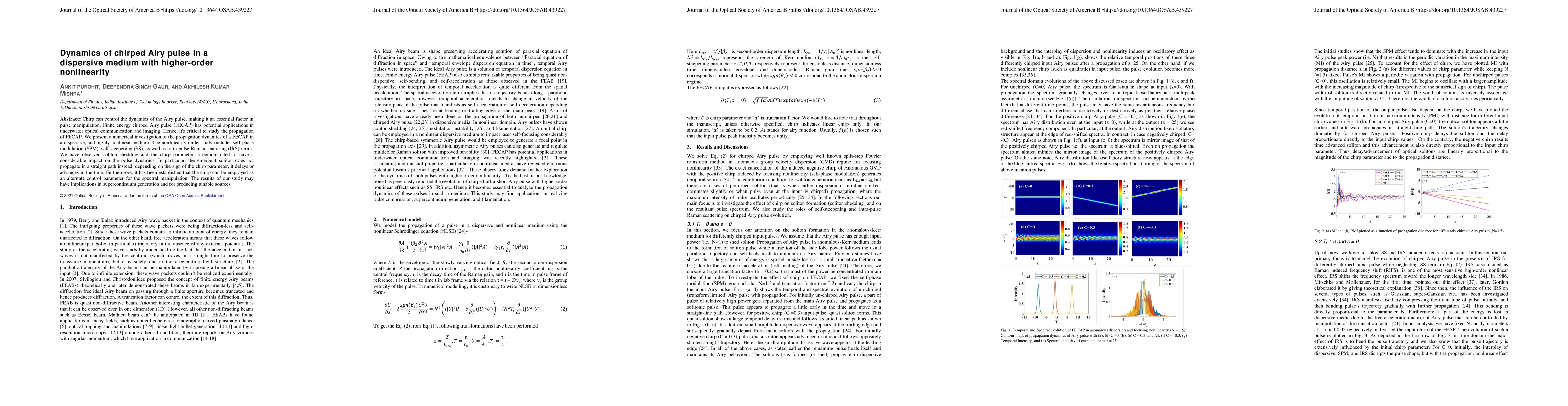Chirp can control the dynamics of the Airy pulse, making it an essential factor in pulse manipulation. Finite energy chirped Airy pulse (FECAP) has potential applications in underwater optical communication and imaging. Hence, it's critical to study the propagation of FECAP. We present a numerical investigation of the propagation dynamics of a FECAP in a dispersive, and highly nonlinear medium. The nonlinearity under study includes self-phase modulation (SPM), self-steepening (SS), as well as intra-pulse Raman scattering (IRS) terms. We have observed soliton shedding and the chirp parameter is demonstrated to have a considerable impact on the pulse dynamics. In particular, the emergent soliton does not propagate in a straight path instead, depending on the sign of the chirp parameter, it delays or advances in the time. Furthermore, it has been established that the chirp can be employed as an alternate control parameter for the spectral manipulation. The results of our study may have implications in supercontinuum generation and for producing tunable sources.