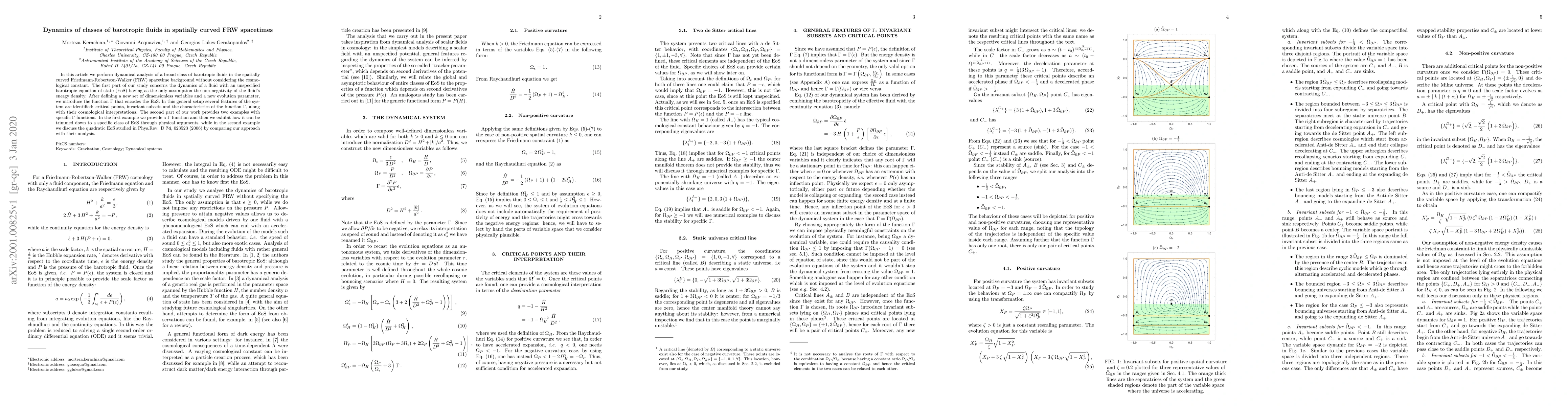 In this article we perform dynamical analysis of a broad class of barotropic fluids in the spatially curved Friedmann-Robertson-Walker (FRW) spacetime background without considering the cosmological constant. The first part of our study concerns the dynamics of a fluid with an unspecified barotropic equation of state (EoS) having as the only assumption the non-negativity of the fluid's energy density. After defining a new set of dimensionless variables and a new evolution parameter, we introduce the function $\Gamma$ that encodes the EoS. In this general setup several features of the system are identified: critical points, invariant subsets and the characteristics of the function $\Gamma$, along with their cosmological interpretations. The second part of our work provides two examples with specific $\Gamma$ functions. In the first example we provide a $\Gamma$ function and then we exhibit how it can be trimmed down to a specific class of EoS through physical arguments, while in the second example we discuss the quadratic EoS studied in Phys.Rev. D {\bf 74}, 023523 (2006) by comparing our approach with their analysis.