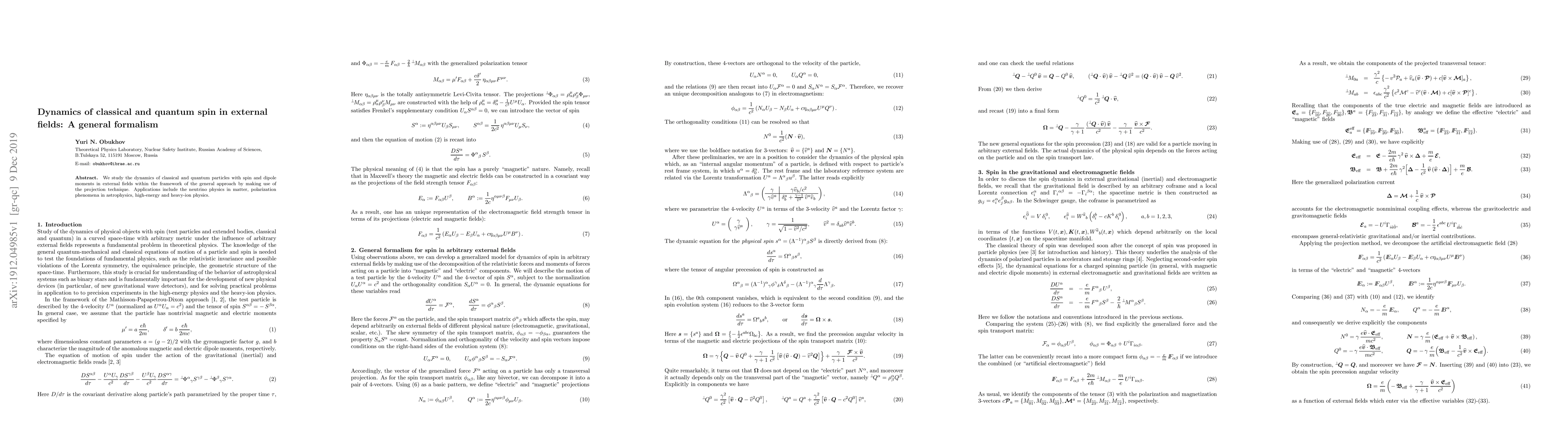 This paper develops a general formalism for the dynamics of classical and quantum spin particles in external fields using projection techniques. It applies this framework to neutrino physics, astrophysical polarization phenomena, and high-energy and heavy-ion physics.