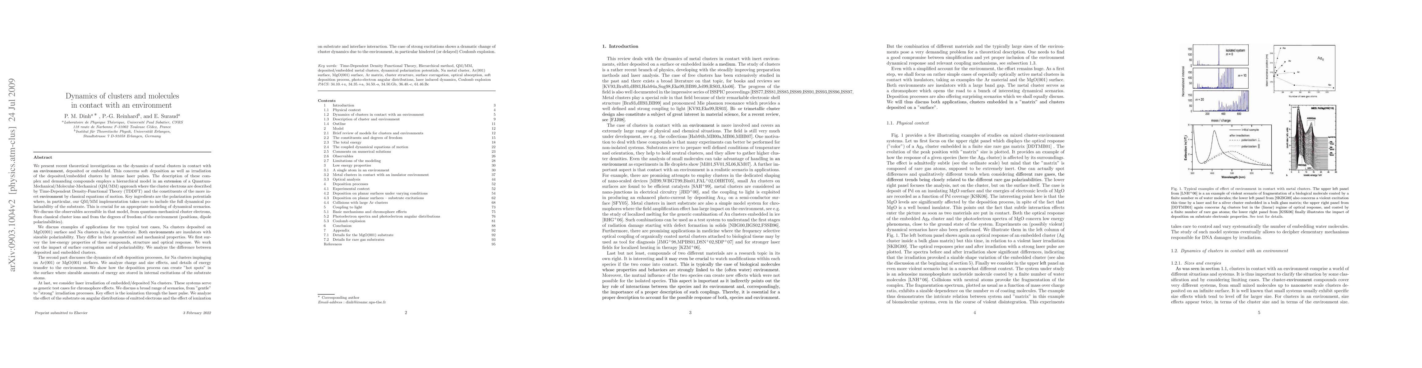 We present recent theoretical investigations on the dynamics of metal clusters in contact with an environment, deposited of embedded. This concerns soft deposition as well as irradiation of the deposited/embedded clusters by intense laser pulses. We discuss examples of applications for two typical test cases, Na clusters deposited on MgO(001) surface and Na clusters in/on Ar substrate. Both environments are insulators with sizeable polarizability. They differ in their geometrical and mechanical properties.