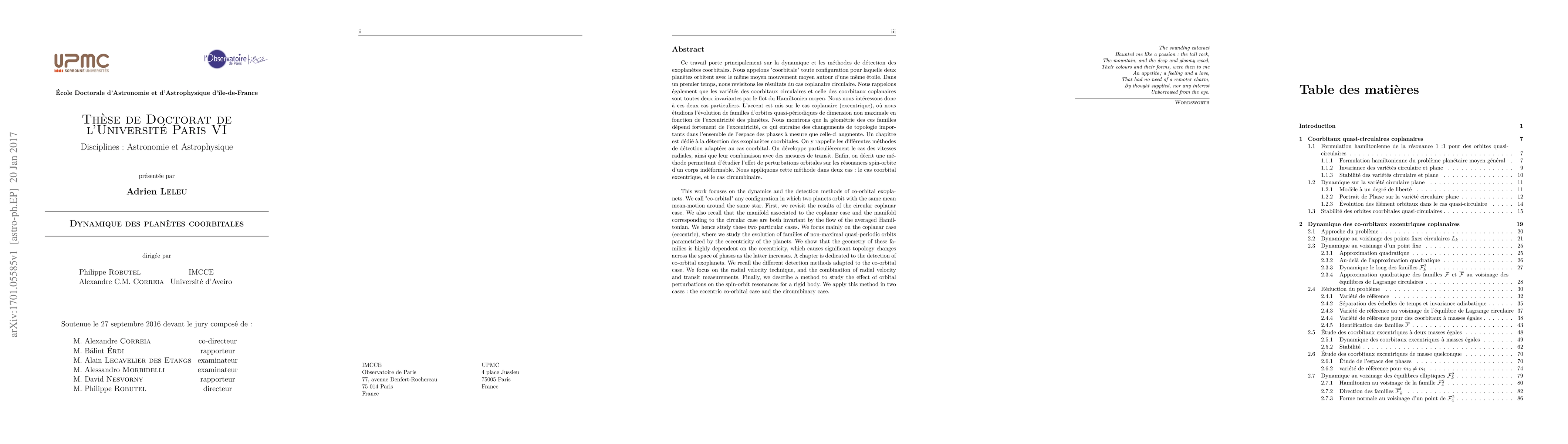 This work focuses on the dynamics and the detection methods of co-orbital exoplanets. We call "co-orbital" any configuration in which two planets orbit with the same mean mean-motion around the same star. First, we revisit the results of the circular coplanar case. We also recall that the manifold associated to the coplanar case and the manifold corresponding to the circular case are both invariant by the flow of the averaged Hamiltonian. We hence study these two particular cases. We focus mainly on the coplanar case (eccentric), where we study the evolution of families of non-maximal quasi-periodic orbits parametrized by the eccentricity of the planets. We show that the geometry of these families is highly dependent on the eccentricity, which causes significant topology changes across the space of phases as the latter increases. A chapter is dedicated to the detection of co-orbital exoplanets. We recall the different detection methods adapted to the co-orbital case. We focus on the radial velocity technique, and the combination of radial velocity and transit measurements. Finally, we describe a method to study the effect of orbital perturbations on the spin-orbit resonances for a rigid body. We apply this method in two cases: the eccentric co-orbital case and the circumbinary case.