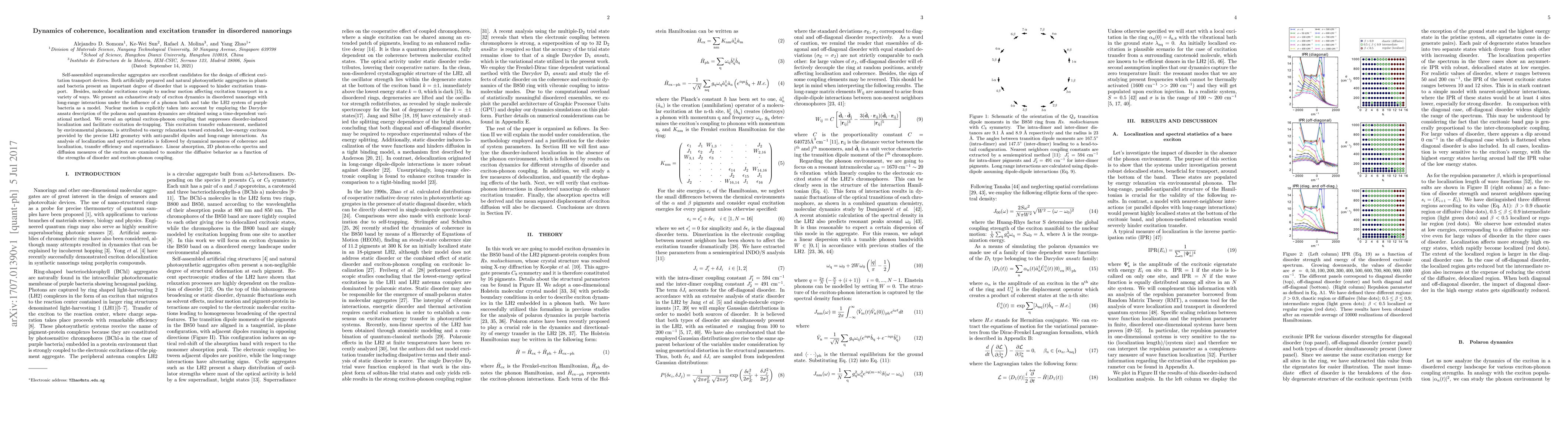 Self-assembled supramolecular aggregates are excellent candidates for the design of efficient excitation transport devices. Both artificially prepared and natural photosynthetic aggregates in plants and bacteria present an important degree of disorder that is supposed to hinder excitation transport. Besides, molecular excitations couple to nuclear motion affecting excitation transport in a variety of ways. We present an exhaustive study of exciton dynamics in disordered nanorings with long-range interactions under the influence of a phonon bath and take the LH2 system of purple bacteria as a model. Nuclear motion is explicitly taken into account by employing the Davydov ansatz description of the polaron and quantum dynamics are obtained using a time-dependent variational method. We reveal an optimal exciton-phonon coupling that suppresses disorder-induced localization and facilitate excitation de-trapping. This excitation transfer enhancement, mediated by environmental phonons, is attributed to energy relaxation toward extended, low-energy excitons provided by the precise LH2 geometry with anti-parallel dipoles and long-range interactions. An analysis of localization and spectral statistics is followed by dynamical measures of coherence and localization, transfer efficiency and superradiance. Linear absorption, 2D photon-echo spectra and diffusion measures of the exciton are examined to monitor the diffusive behavior as a function of the strengths of disorder and exciton-phonon coupling.