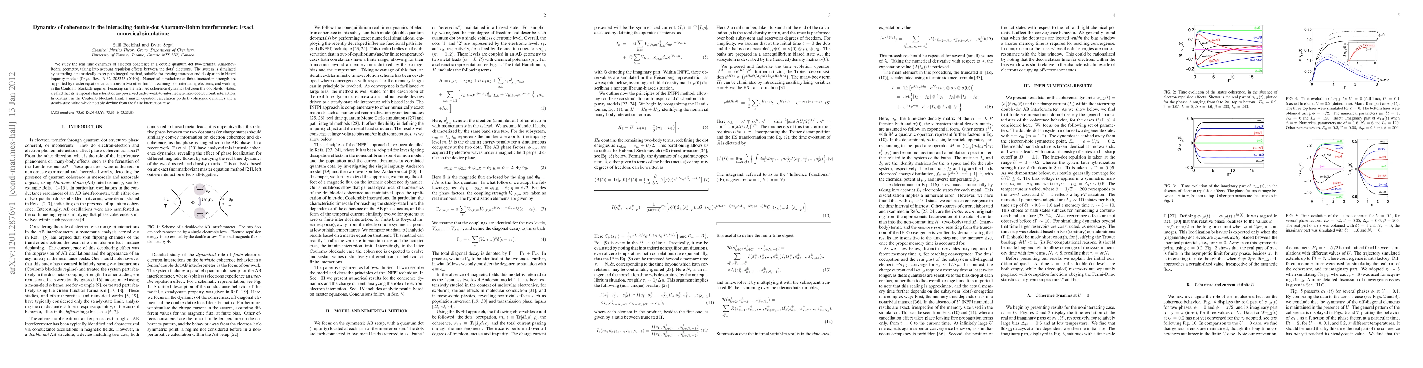 We study the real time dynamics of electron coherence in a double quantum dot two-terminal Aharonov-Bohm geometry, taking into account repulsion effects between the dots' electrons. The system is simulated by extending a numerically exact path integral method, suitable for treating transport and dissipation in biased impurity models [Phys. Rev. B 82, 205323 (2010)]. Numerical simulations at finite interaction strength are supported by master equation calculations in two other limits: assuming non-interacting electrons, and working in the Coulomb blockade regime. Focusing on the intrinsic coherence dynamics between the double-dot states, we find that its temporal characteristics are preserved under weak-to-intermediate inter-dot Coulomb interaction. In contrast, in the Coulomb blockade limit, a master equation calculation predicts coherence dynamics and a steady-state value which notably deviate from the finite interaction case.