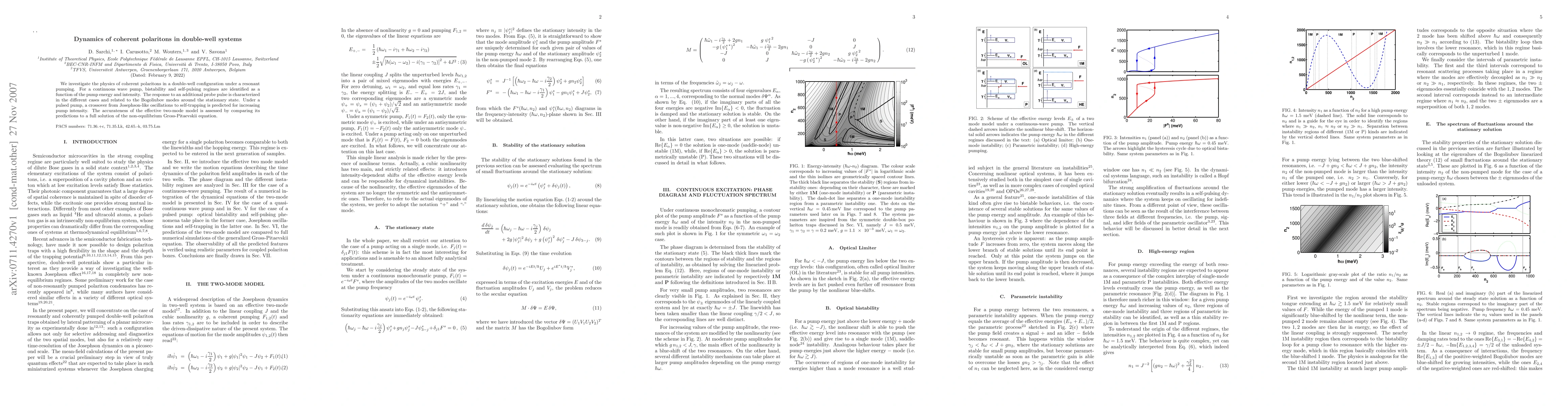 We investigate the physics of coherent polaritons in a double-well configuration under a resonant pumping. For a continuous wave pump, bistability and self-pulsing regimes are identified as a function of the pump energy and intensity. The response to an additional probe pulse is characterized in the different cases and related to the Bogoliubov modes around the stationary state. Under a pulsed pump, a crossover from Josephson-like oscillations to self-trapping is predicted for increasing pump intensity. The accurateness of the effective two-mode model is assessed by comparing its predictions to a full solution of the non-equilibrium Gross-Pitaevskii equation.