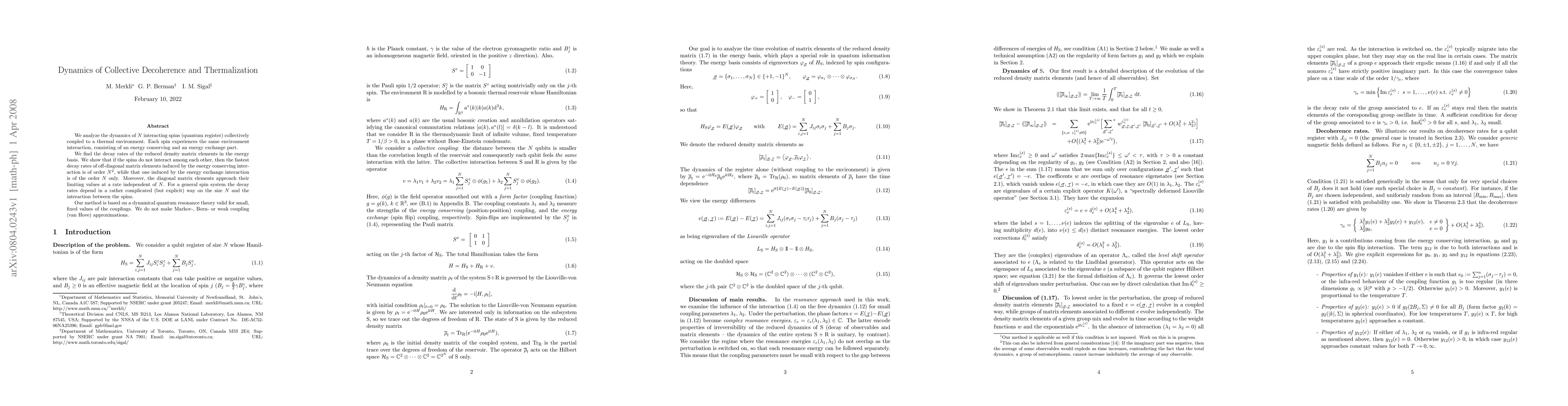 We analyze the dynamics of N interacting spins (quantum register) collectively coupled to a thermal environment. Each spin experiences the same environment interaction, consisting of an energy conserving and an energy exchange part. We find the decay rates of the reduced density matrix elements in the energy basis. We show that if the spins do not interact among each other, then the fastest decay rates of off-diagonal matrix elements induced by the energy conserving interaction is of order N^2, while that one induced by the energy exchange interaction is of the order N only. Moreover, the diagonal matrix elements approach their limiting values at a rate independent of N. For a general spin system the decay rates depend in a rather complicated (but explicit) way on the size N and the interaction between the spins. Our method is based on a dynamical quantum resonance theory valid for small, fixed values of the couplings. We do not make Markov-, Born- or weak coupling (van Hove) approximations.