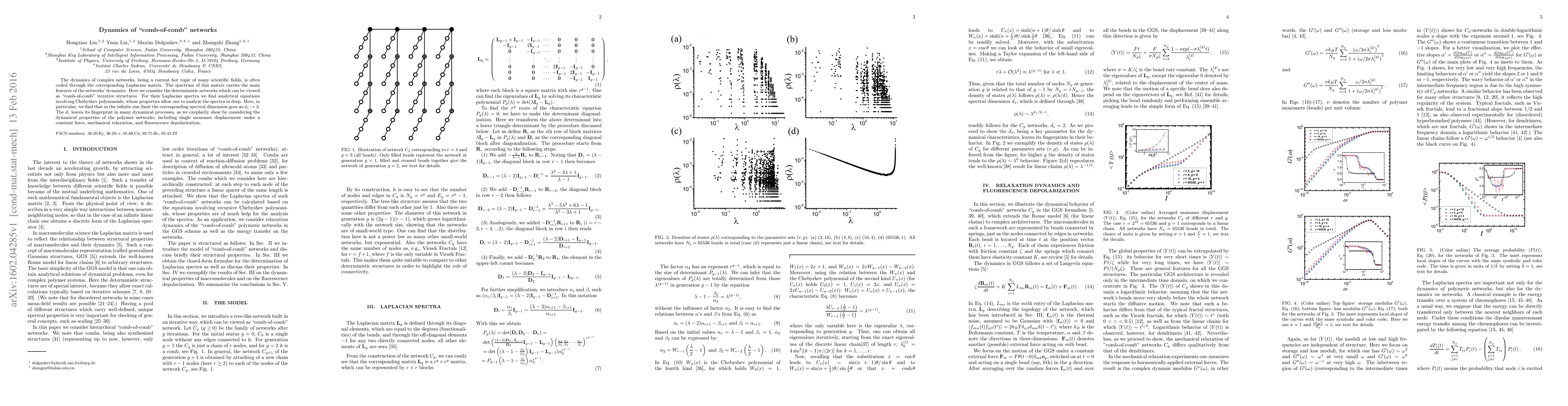 The dynamics of complex networks, being a current hot topic of many scientific fields, is often coded through the corresponding Laplacian matrix. The spectrum of this matrix carries the main features of the networks' dynamics. Here we consider the deterministic networks which can be viewed as "comb-of-comb" iterative structures. For their Laplacian spectra we find analytical equations involving Chebyshev polynomials, whose properties allow one to analyze the spectra in deep. Here, in particular, we find that in the infinite size limit the corresponding spectral dimension goes as $d_s\rightarrow2$. The $d_s$ leaves its fingerprint in many dynamical processes, as we exeplarily show by considering the dynamical properties of the polymer networks, including single monomer displacement under a constant force, mechanical relaxation, and fluorescence depolarization.