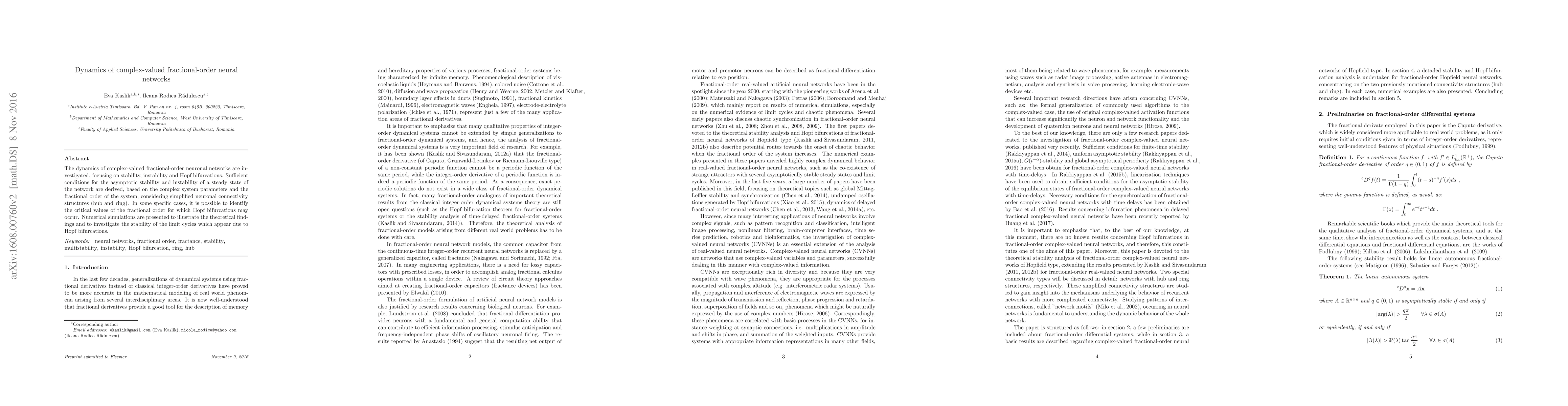 Researchers investigated the stability and dynamics of complex-valued fractional-order neural networks, finding conditions for asymptotic stability and instability, as well as critical values for Hopf bifurcations.