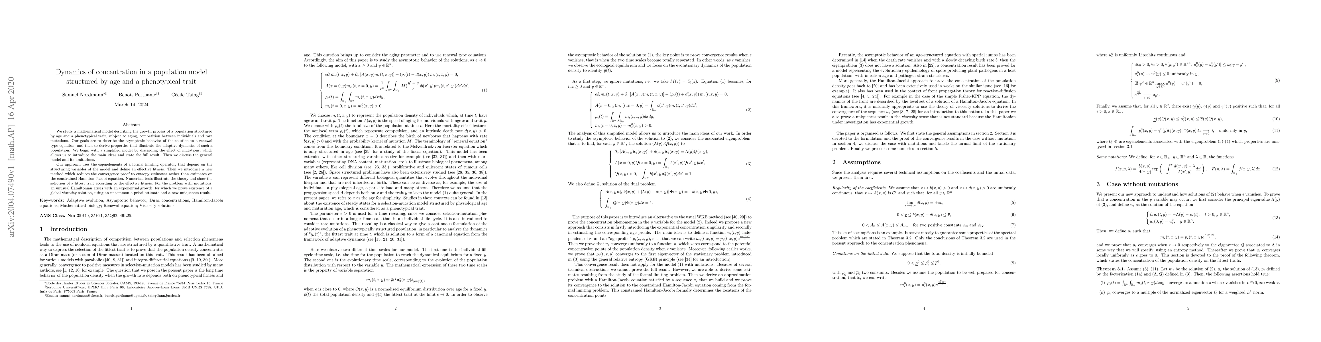 This paper develops a mathematical model to study the dynamics of a population structured by age and a phenotypical trait, focusing on aging, competition, and rare mutations. It uses eigenelements and entropy estimates to analyze the asymptotic behavior and adaptive dynamics, proving existence of a global viscosity solution for the mutation problem.