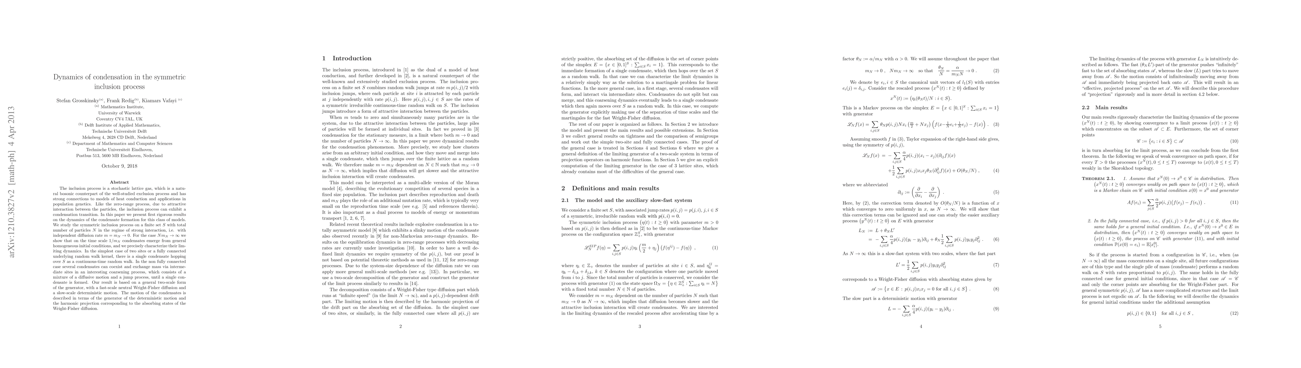 The inclusion process is a stochastic lattice gas, which is a natural bosonic counterpart of the well-studied exclusion process and has strong connections to models of heat conduction and applications in population genetics. Like the zero-range process, due to attractive interaction between the particles, the inclusion process can exhibit a condensation transition. In this paper we present first rigorous results on the dynamics of the condensate formation for this class of models. We study the symmetric inclusion process on a finite set $S$ with total number of particles $N$ in the regime of strong interaction, i.e. with independent diffusion rate $m=m_N \to 0$. For the case $N m_N\to\infty$ we show that on the time scale $1/m_N$ condensates emerge from general homogeneous initial conditions, and we precisely characterize their limiting dynamics. In the simplest case of two sites or a fully connected underlying random walk kernel, there is a single condensate hopping over $S$ as a continuous-time random walk. In the non fully connected case several condensates can coexist and exchange mass via intermediate sites in an interesting coarsening process, which consists of a mixture of a diffusive motion and a jump process, until a single condensate is formed. Our result is based on a general two-scale form of the generator, with a fast-scale neutral Wright-Fisher diffusion and a slow-scale deterministic motion. The motion of the condensates is described in terms of the generator of the deterministic motion and the harmonic projection corresponding to the absorbing states of the Wright-Fisher diffusion.