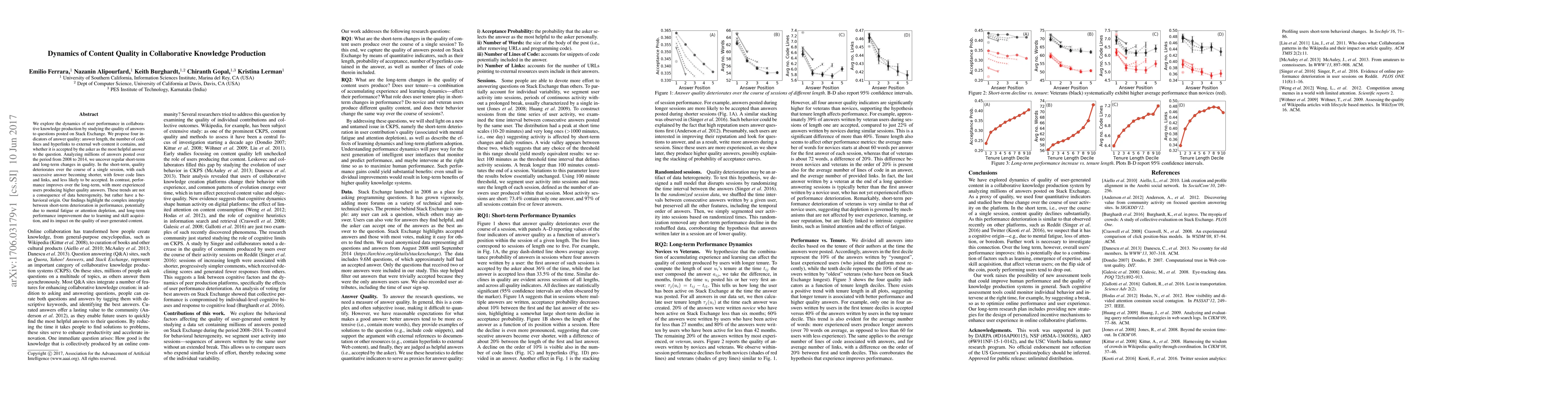 We explore the dynamics of user performance in collaborative knowledge production by studying the quality of answers to questions posted on Stack Exchange. We propose four indicators of answer quality: answer length, the number of code lines and hyperlinks to external web content it contains, and whether it is accepted by the asker as the most helpful answer to the question. Analyzing millions of answers posted over the period from 2008 to 2014, we uncover regular short-term and long-term changes in quality. In the short-term, quality deteriorates over the course of a single session, with each successive answer becoming shorter, with fewer code lines and links, and less likely to be accepted. In contrast, performance improves over the long-term, with more experienced users producing higher quality answers. These trends are not a consequence of data heterogeneity, but rather have a behavioral origin. Our findings highlight the complex interplay between short-term deterioration in performance, potentially due to mental fatigue or attention depletion, and long-term performance improvement due to learning and skill acquisition, and its impact on the quality of user-generated content.