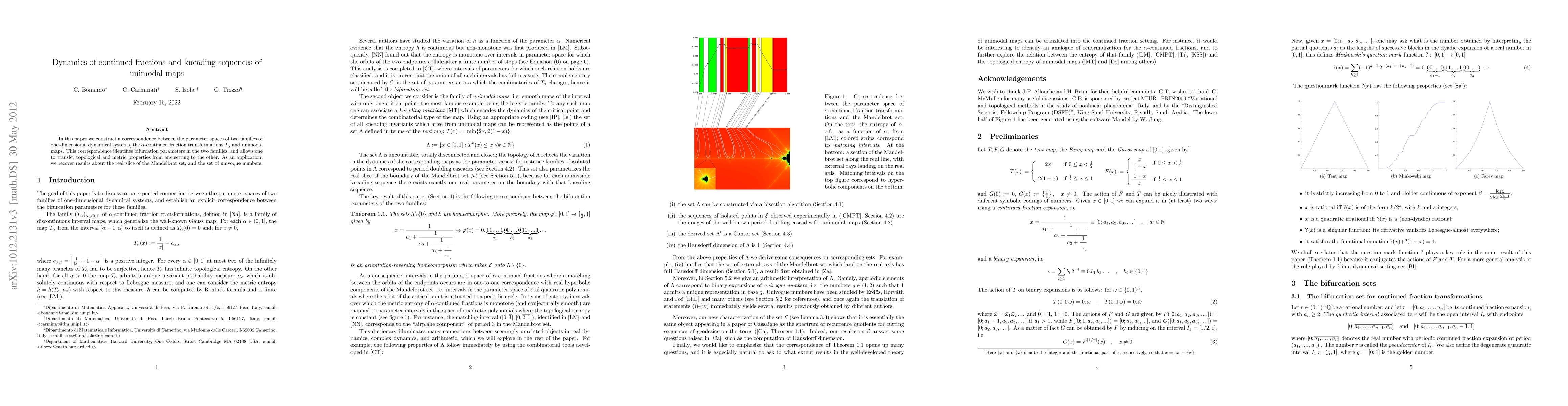 In this paper we construct a correspondence between the parameter spaces of two families of one-dimensional dynamical systems, the alpha-continued fraction transformations T_alpha and unimodal maps. This correspondence identifies bifurcation parameters in the two families, and allows one to transfer topological and metric properties from one setting to the other. As an application, we recover results about the real slice of the Mandelbrot set, and the set of univoque numbers.