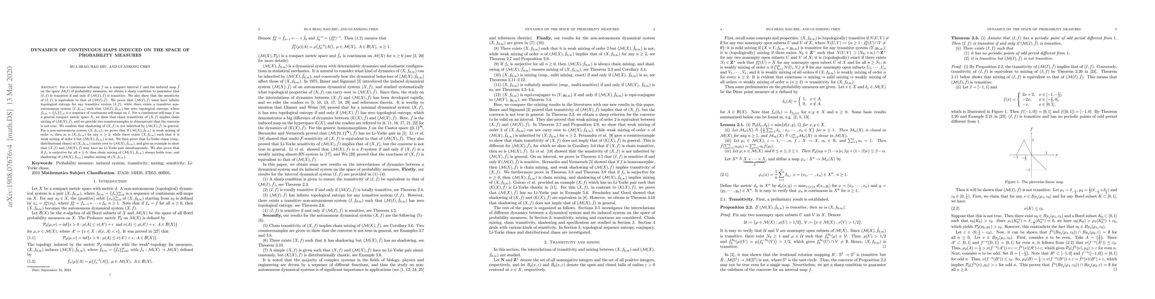 For a continuous self-map $f$ on a compact interval $I$ and the induced map $\hat f$ on the space $\mathcal{M}(I)$ of probability measures, we obtain a sharp condition to guarantee that $(I,f)$ is transitive if and only if $(\mathcal{M}(I),\hat f)$ is transitive. We also show that the sensitivity of $(I,f)$ is equivalent to that of $(\mathcal{M}(I),\hat f)$. We prove that $(\mathcal{M}(I),\hat f)$ must have infinite topological entropy for any transitive system $(I,f)$, while there exists a transitive non-autonomous system $(I,f_{0,\infty})$ such that $(\mathcal{M}(I),\hat f_{0,\infty})$ has zero topological entropy, where $f_{0,\infty}=\{f_n\}_{n=0}^\infty$ is a sequence of continuous self-maps on $I$. For a continuous self-map $f$ on a general compact metric space $X$, we show that chain transitivity of $(X, f)$ implies chain mixing of $(\mathcal{M}(X),\hat f)$, and we provide two counterexamples to demonstrate that the converse is not true. We confirm that shadowing of $(X,f)$ is not inherited by $(\mathcal{M}(X),\hat f)$ in general. For a non-autonomous system $(X,f_{0,\infty})$, we prove that if $(\mathcal{M}(X),\hat{f}_{0,\infty})$ is weak mixing of order $n$, then so is $(X,f_{0,\infty})$ for any $n\geq2$; while there exists $(X,f_{0,\infty})$ such that it is weak mixing of order $2$ but $(\mathcal{M} (X),\hat{f}_{0,\infty})$ is not. We then prove that Li-Yorke chaos (resp., distributional chaos) of $(X,f_{0,\infty})$ carries over to $(\mathcal{M}(X),\hat f_{0,\infty})$, and give an example to show that $(X,f)$ and $(\mathcal{M}(X),\hat f)$ may have no Li-Yorke pair simultaneously. We also prove that if $f_n$ is surjective for all $n\geq 0$, then chain mixing of $(\mathcal{M}(X),\hat f_{0,\infty})$ always holds true, and shadowing of $(\mathcal{M}(X),\hat f_{0,\infty})$ implies mixing of $(X, f_{0,\infty})$.