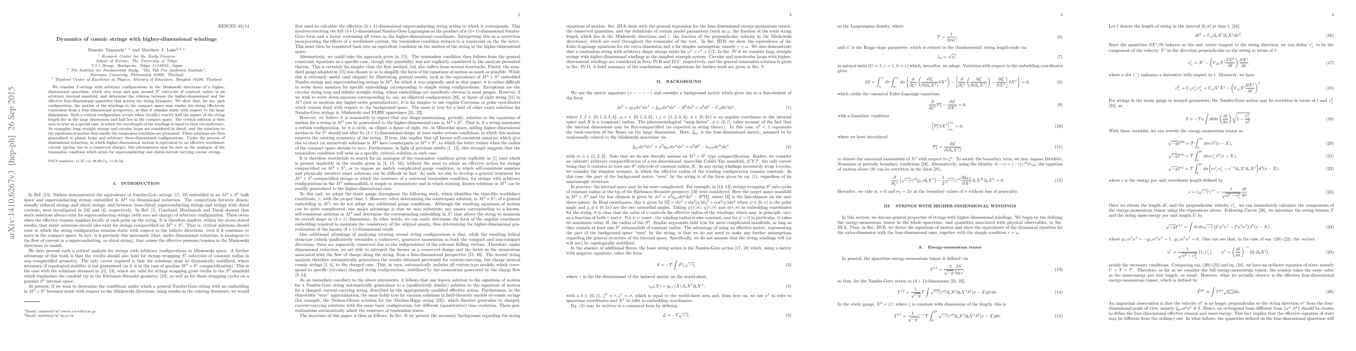 This paper investigates the dynamics of F-strings in higher-dimensional spacetimes, revealing that windings in compact spaces can make strings effectively tensionless in four dimensions. The critical configuration occurs when half the string length lies in the large dimensions and half in the compact space, leading to static behavior.