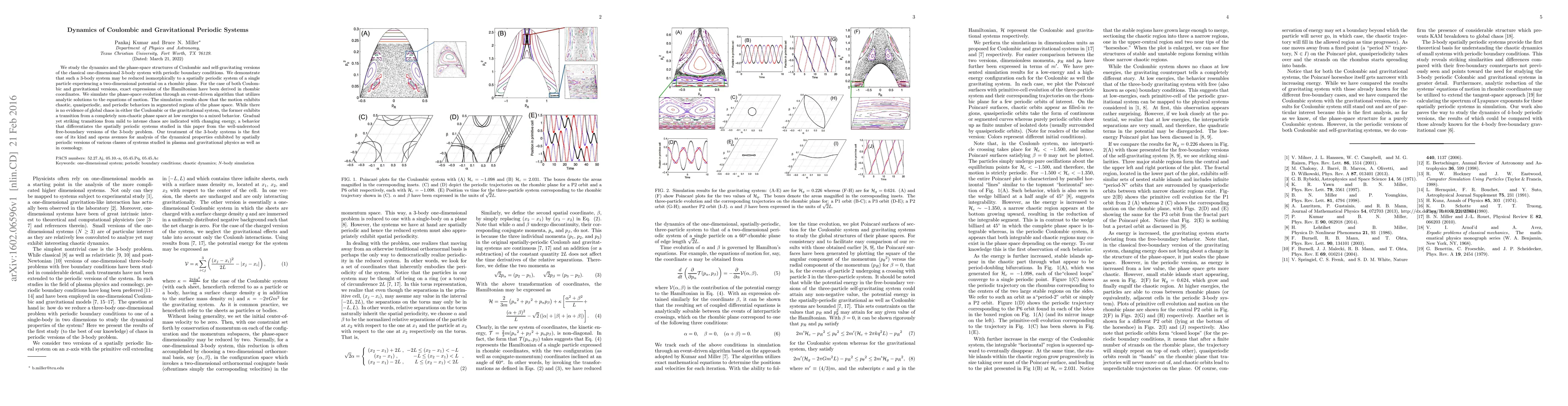 We study the dynamics and the phase-space structures of Coulombic and self-gravitating versions of the classical one-dimensional 3-body system with periodic boundary conditions. We demonstrate that such a 3-body system may be reduced isomorphically to a spatially periodic system of a single particle experiencing a two-dimensional potential on a rhombic plane. For the case of both Coulombic and gravitational versions, exact expressions of the Hamiltonian have been derived in rhombic coordinates. We simulate the phase-space evolution through an event-driven algorithm that utilizes analytic solutions to the equations of motion. The simulation results show that the motion exhibits chaotic, quasiperiodic, and periodic behaviors in segmented regions of the phase space. While there is no evidence of global chaos in either the Coulombic or the gravitational system, the former exhibits a transition from a completely non-chaotic phase space at low energies to a mixed behavior. Gradual yet striking transitions from mild to intense chaos are indicated with changing energy, a behavior that differentiates the spatially periodic systems studied in this paper from the well-understood free-boundary versions of the 3-body problem. Our treatment of the 3-body systems is the first one of its kind and opens avenues for analysis of the dynamical properties exhibited by spatially periodic versions of various classes of systems studied in plasma and gravitational physics as well as in cosmology.